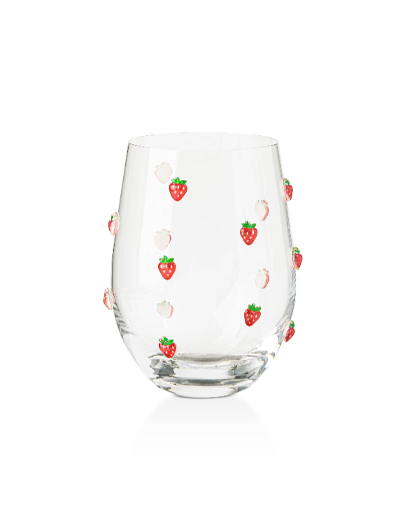 Fun and fruity stemless wine glass with 3D Strawberry icon. The perfect addition to any bar cart or fun table setting.