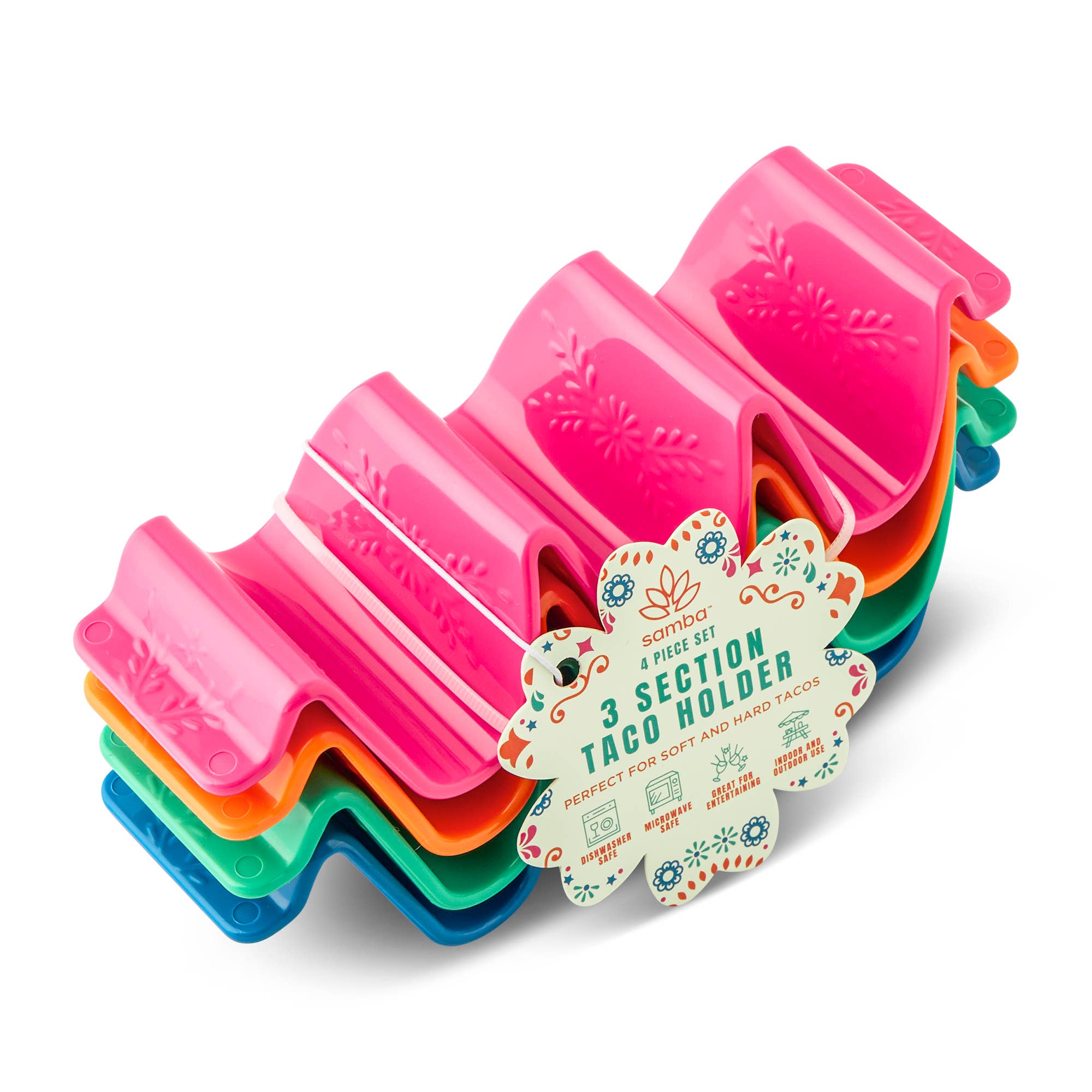 4 pack of embossed taco holders for hard or soft shell tacos! Dishwasher and microwave safe.