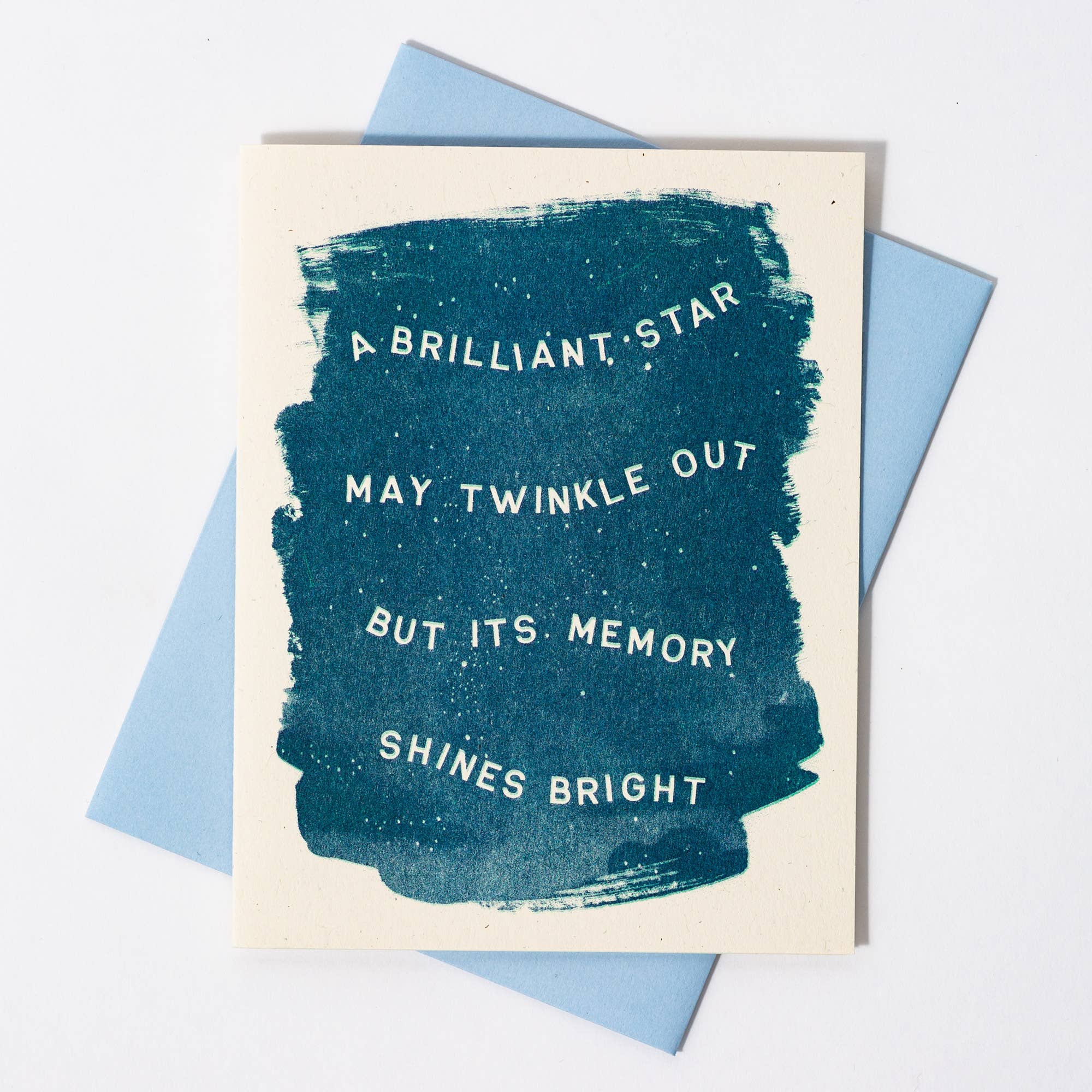 35th Louie Award Winner for "Superbly Stated" - A brilliant star may twinkle out, but its memory shines bright. The lovely sentiment is traced among little pinpoints of starlight to comfort the grieving. Risograph printed in seafoam and federal blue.