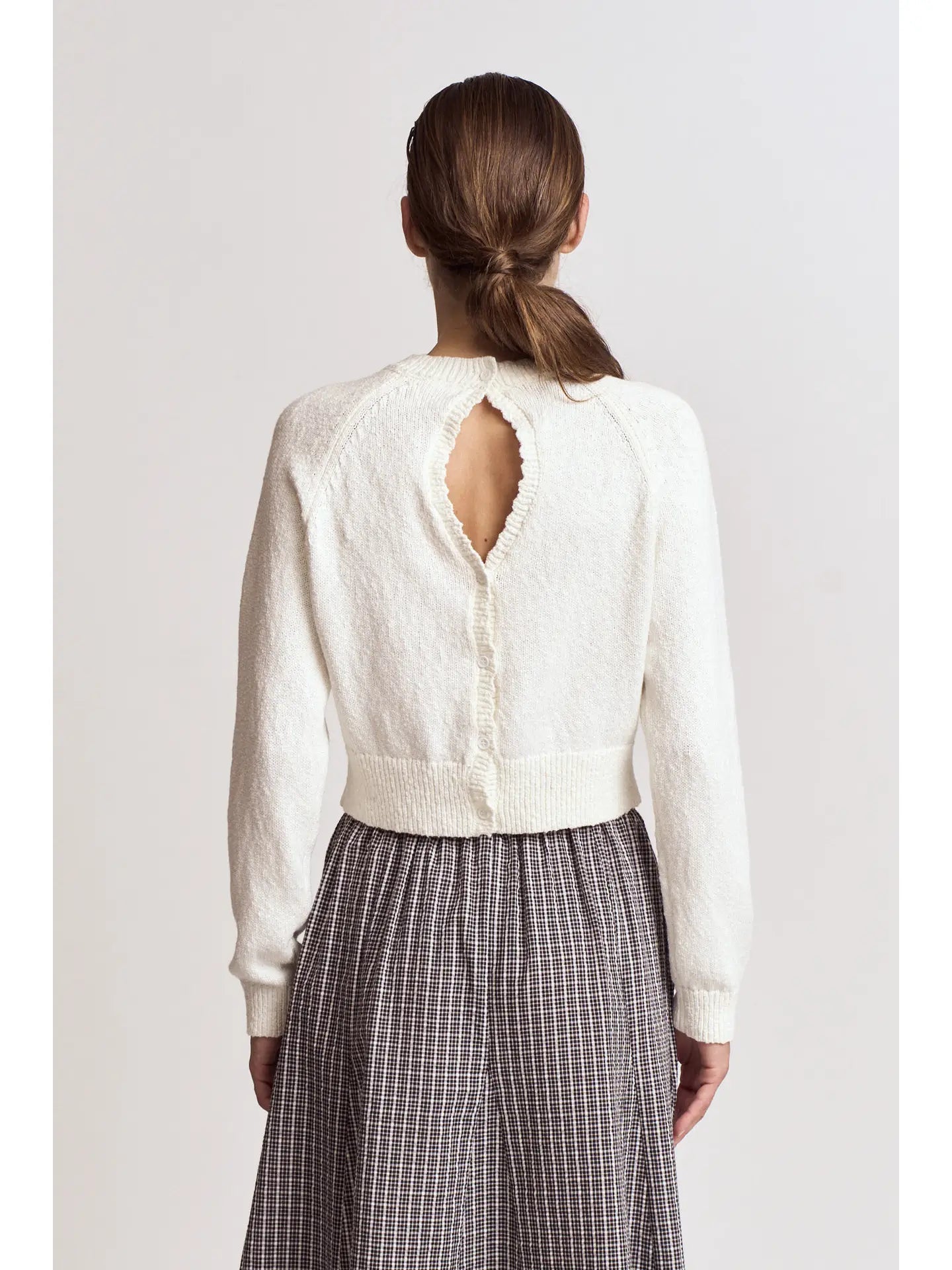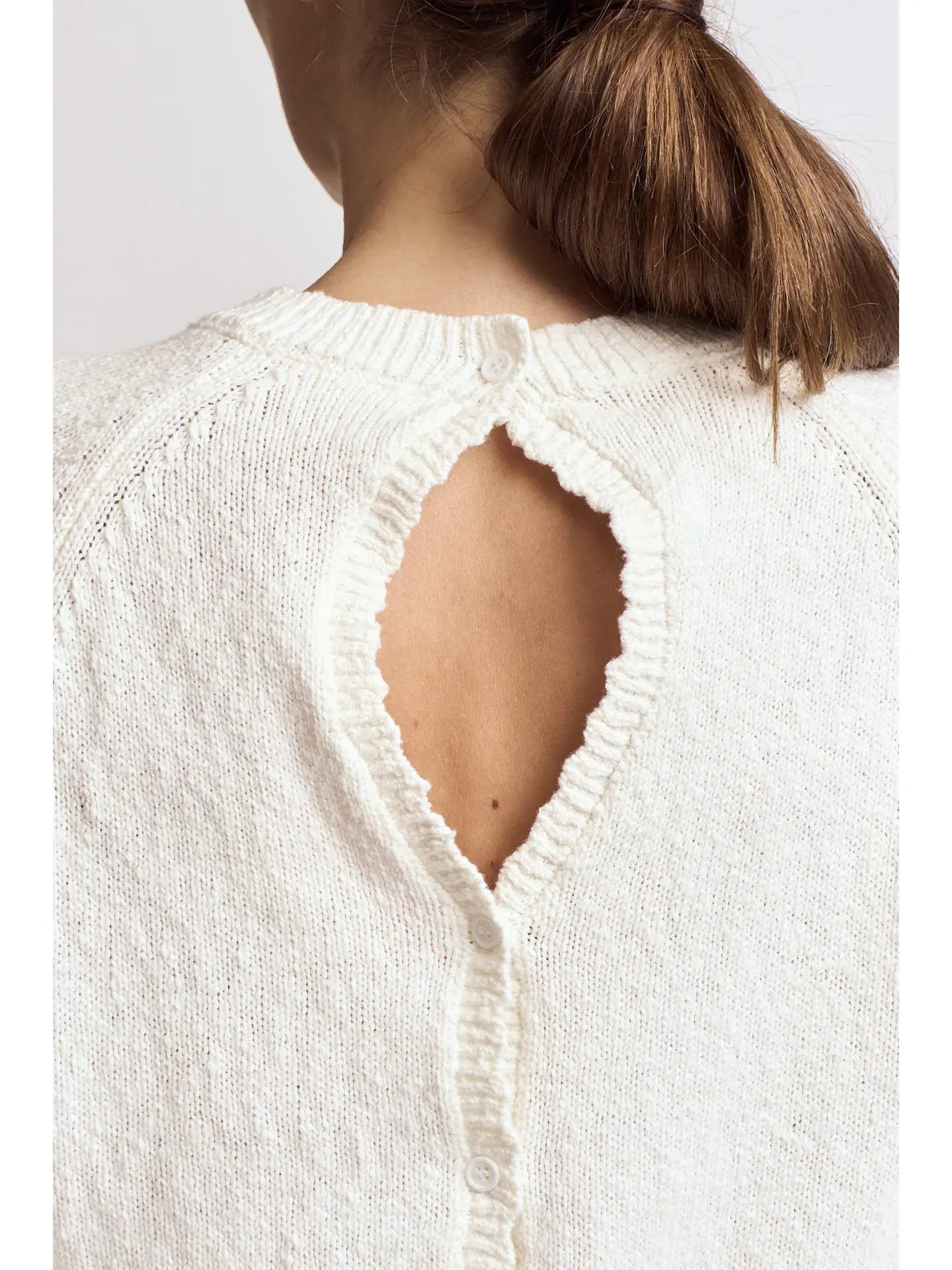 A beautiful pullover knit sweater with a cut out scalloped back detail. Perfect on its own or layering over sleeveless dresses in spring.