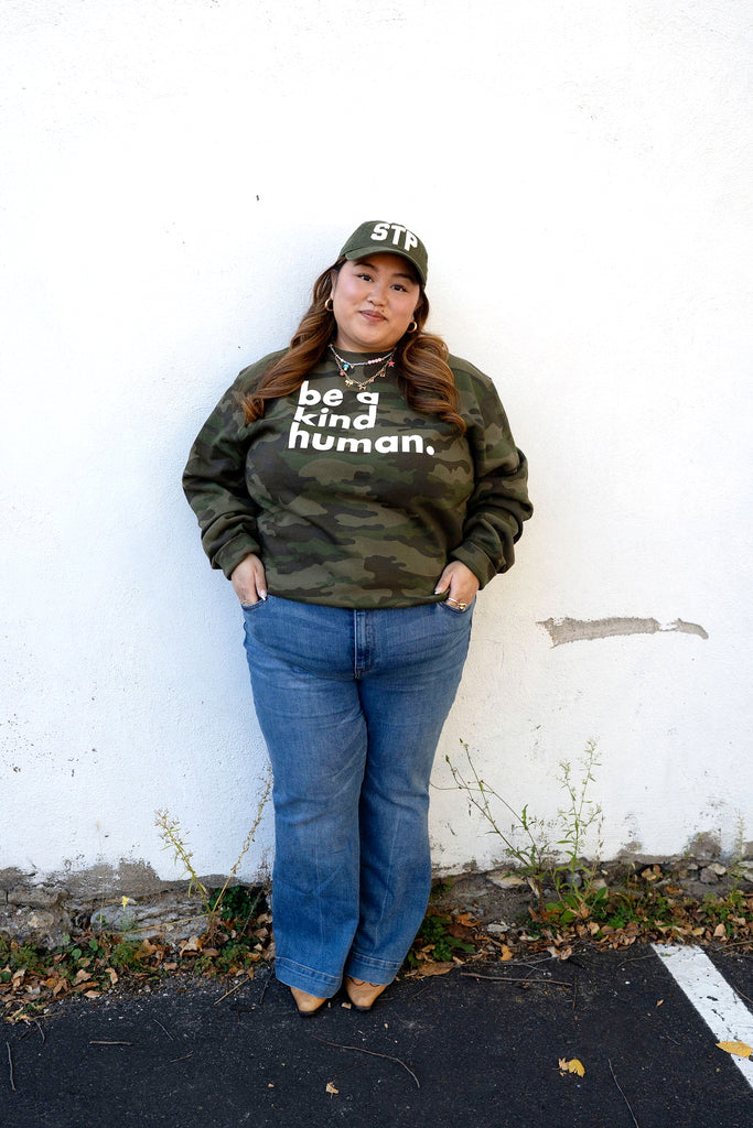Be a Kind Human Camo Unisex Crew Sweatshirt - M is backordered and will ship as soon as it is back in stock.