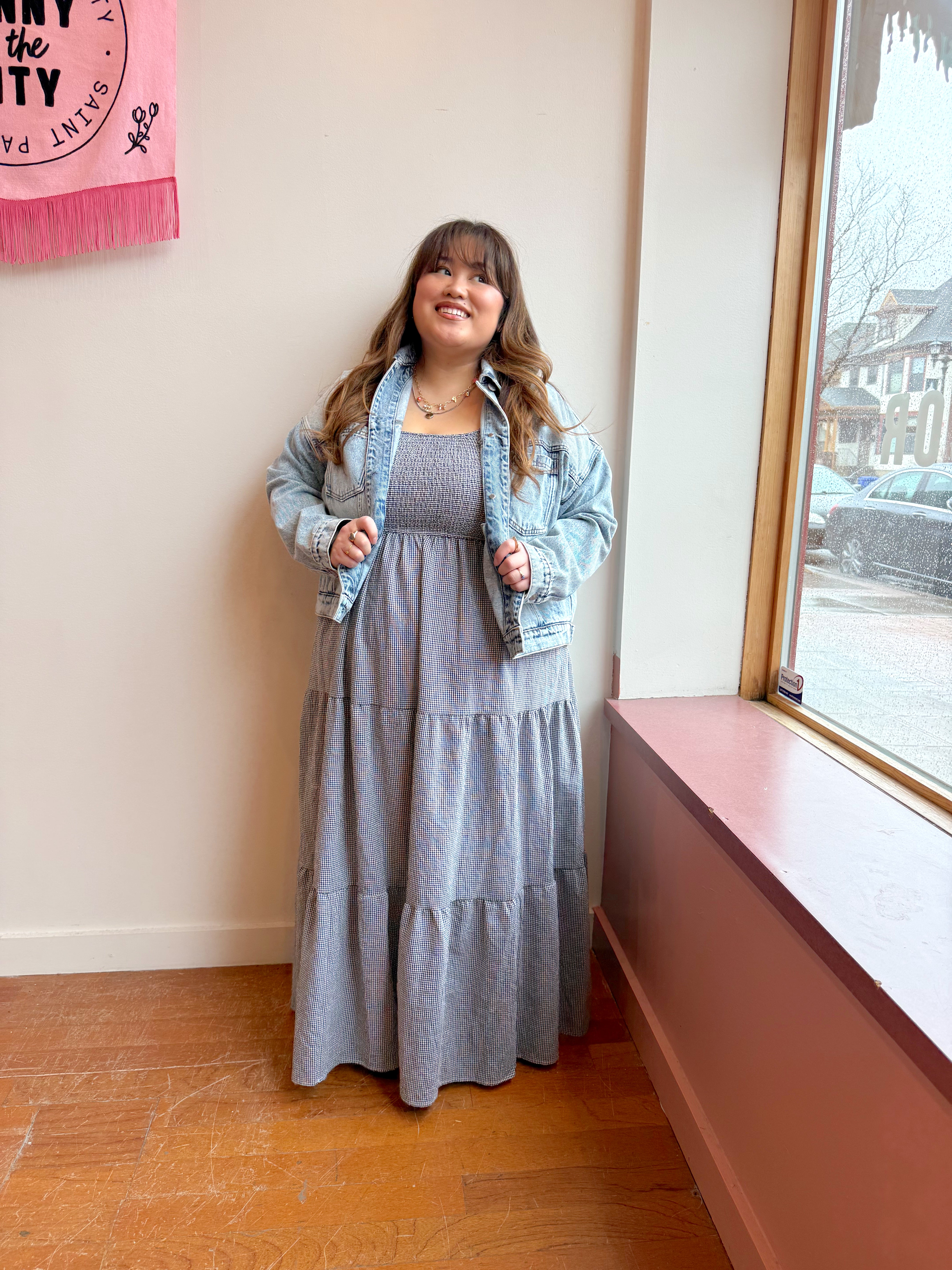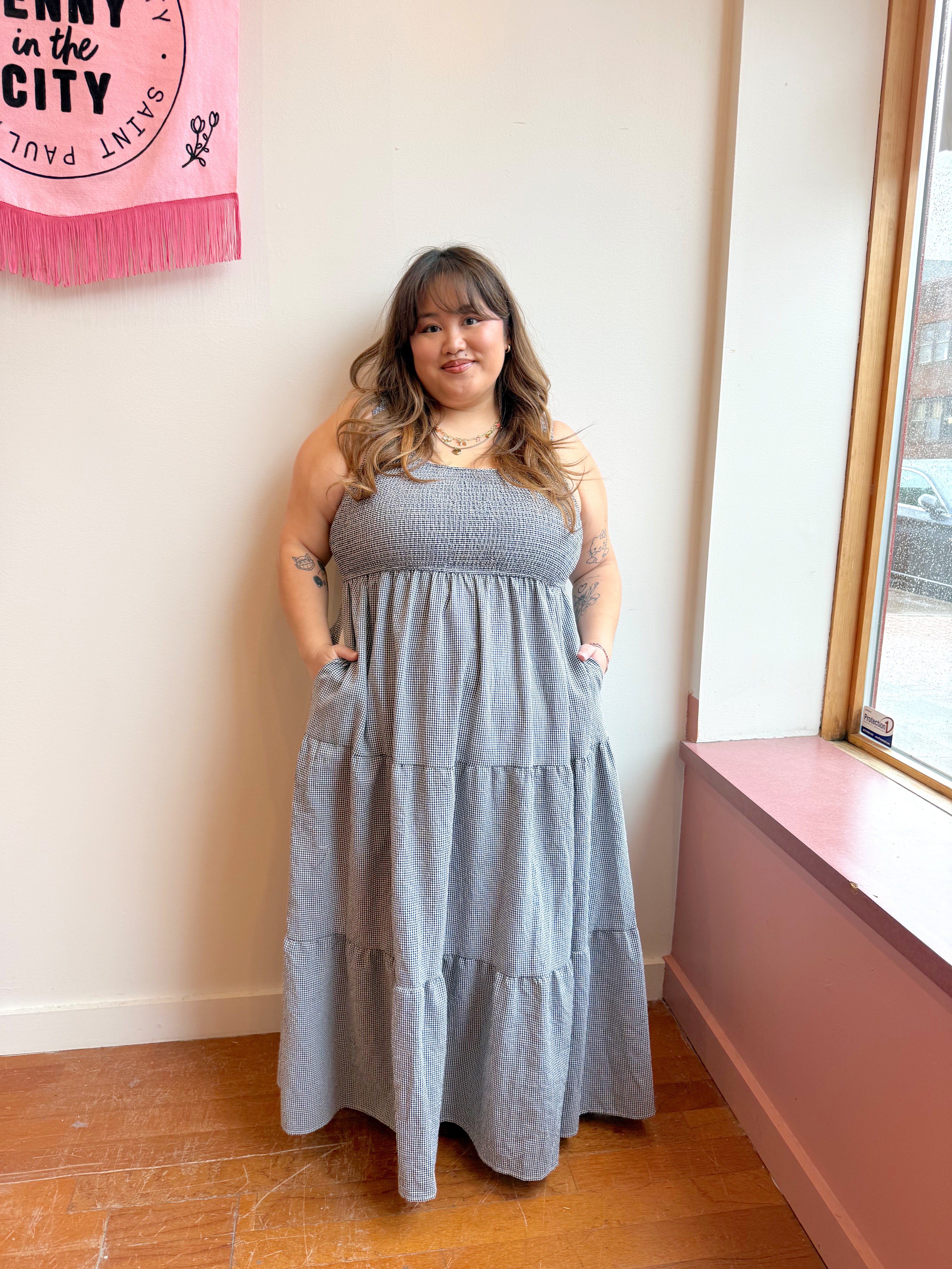 A beautiful midi length gingham dress with a sleeveless stretchy top and tiered body.