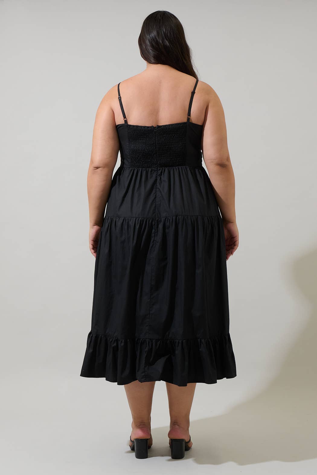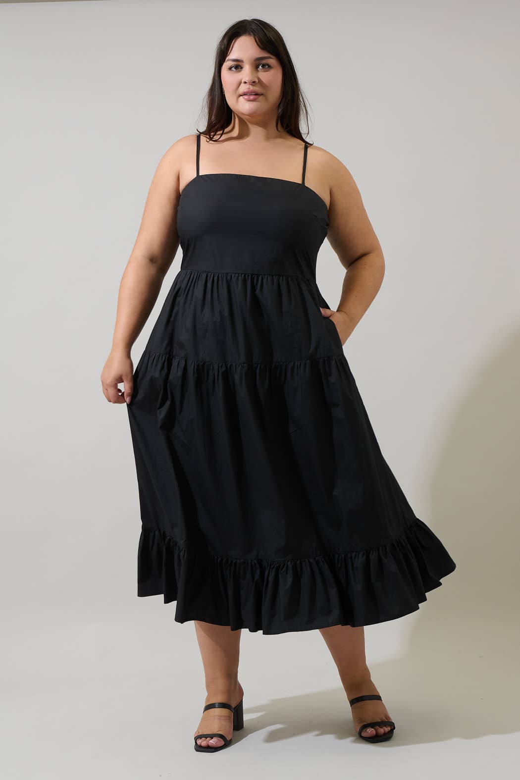 A timeless black summer midi dress with adjustable straps, tiered body, and pockets!