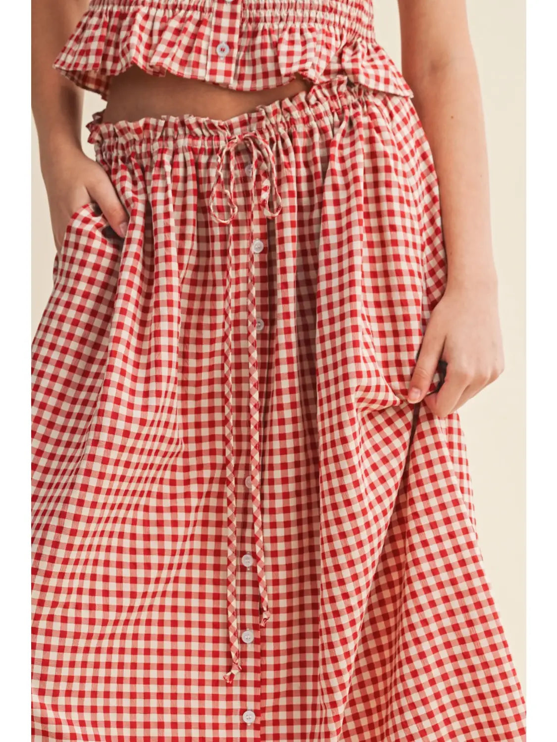 Cherry colored gingham skirt with drawstring waist, easy fit, button front detailing, and pockets.