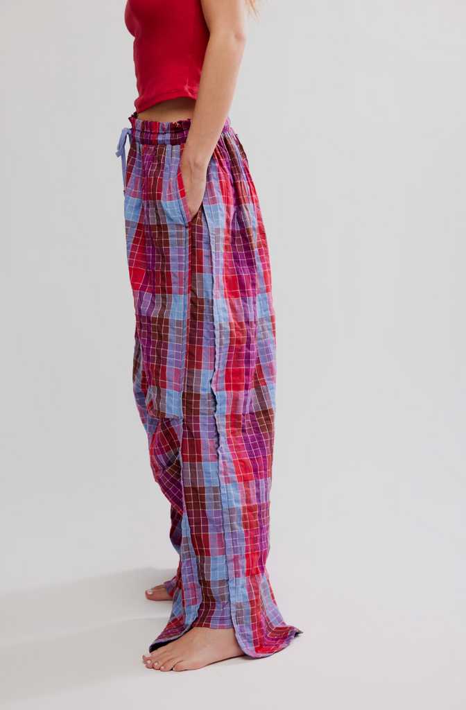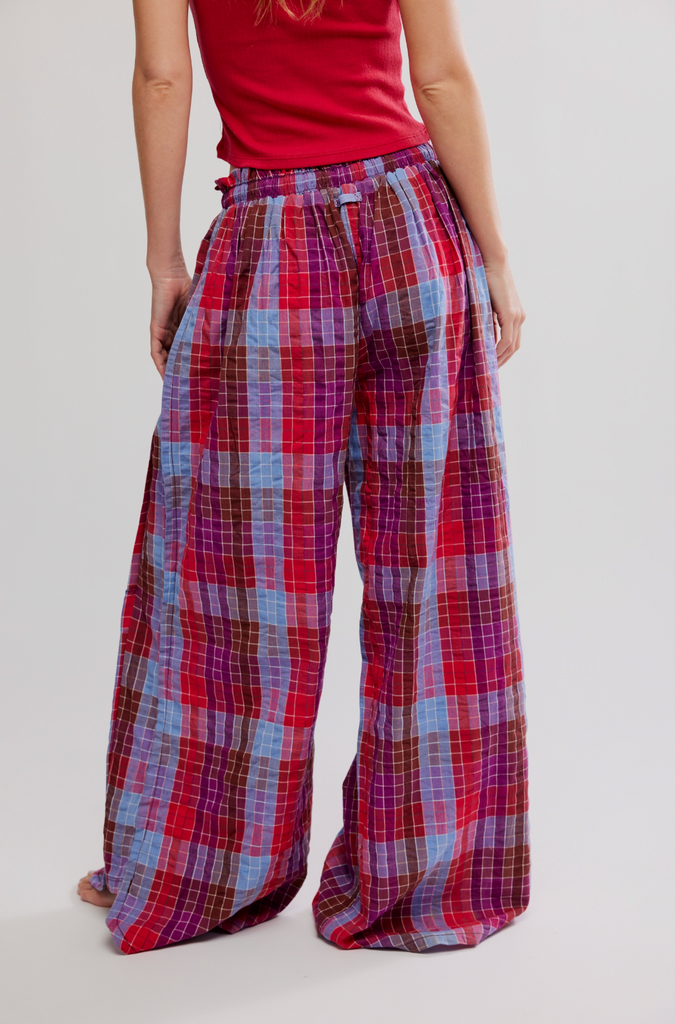 Stay cozy this winter in these loose fit plaid lounge pants from Free People. Featuring a wide leg flowy fit, drawstring, and pull on waist.