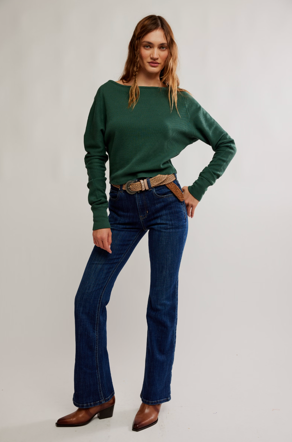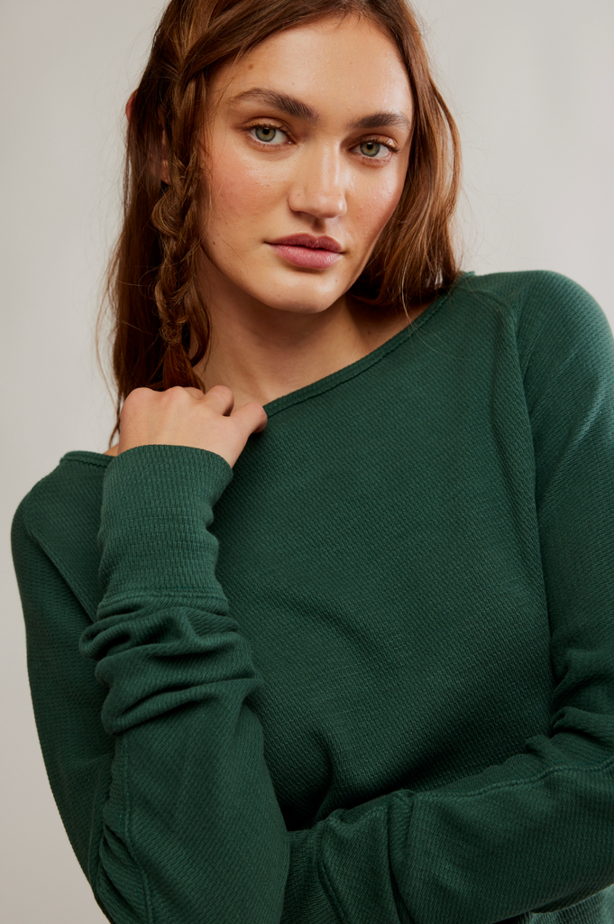A cozy base for endless outfitting, this long sleeve from We The Free is featured in a thermal fabrication with a flattering boat neckline and slouchy dolman sleeves.