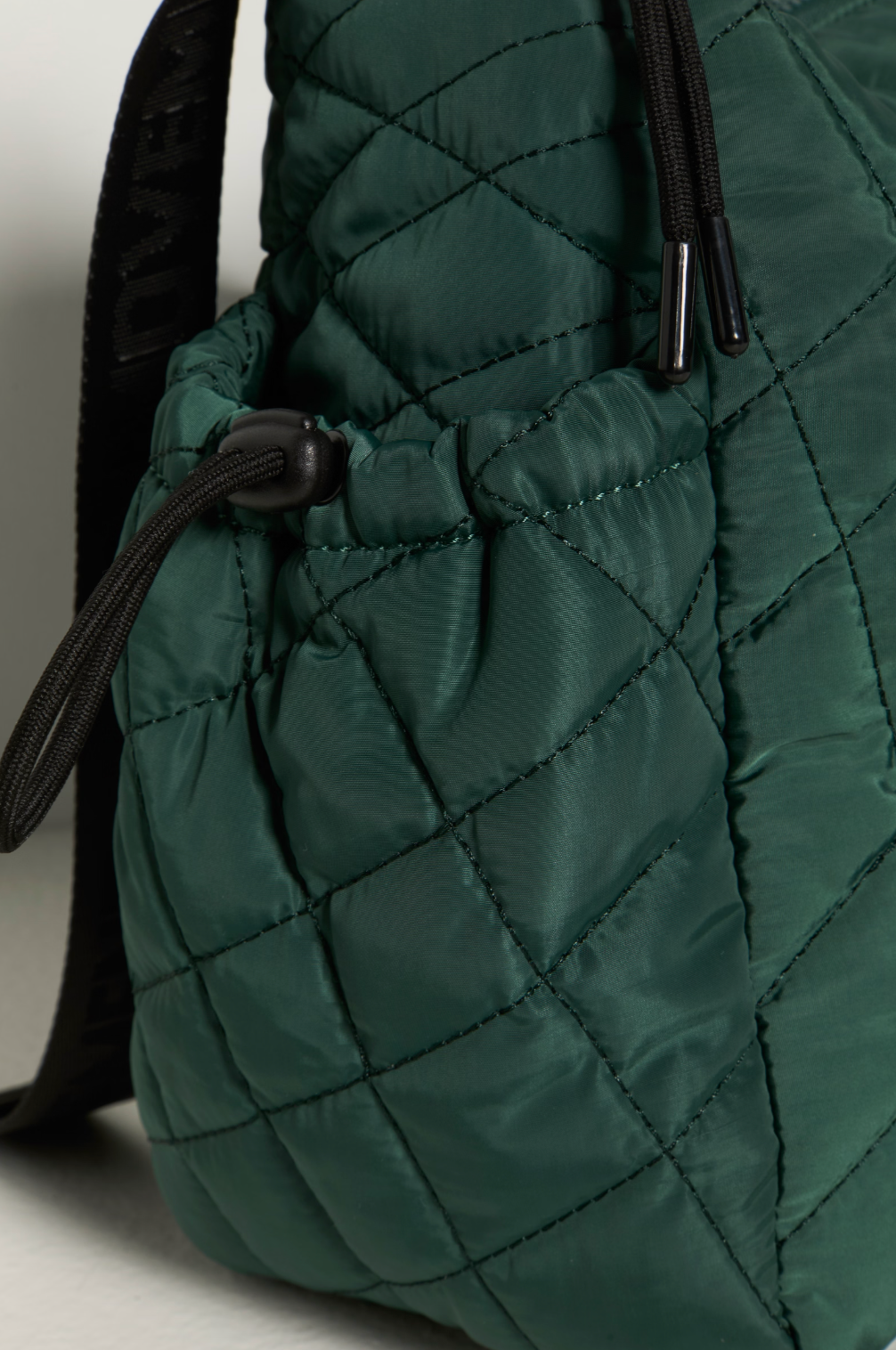 Features: Oversized style, quilted fabrication, fully lined interior, adjustable shoulder strap, interior zip pocket, drawstring-adorned side pockets