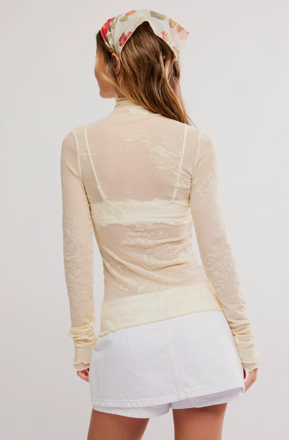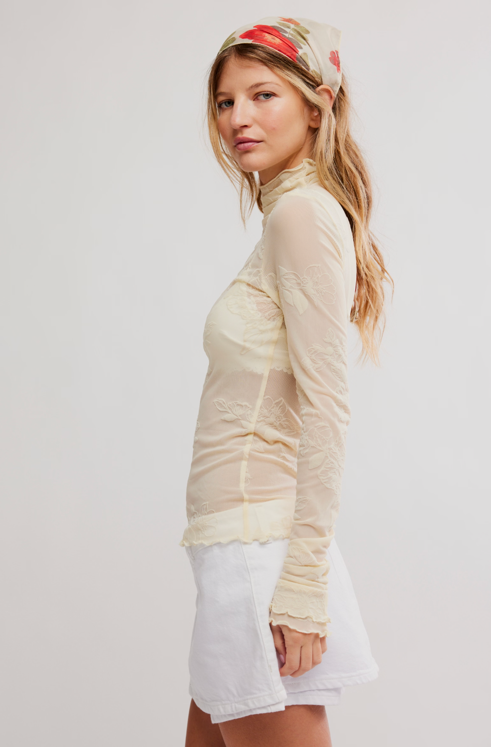Edgy and perfect for layering, this long sleeve from Intimately features a sheer mesh fabrication, a mock neck design, and a lettuce trim for an added dimension.