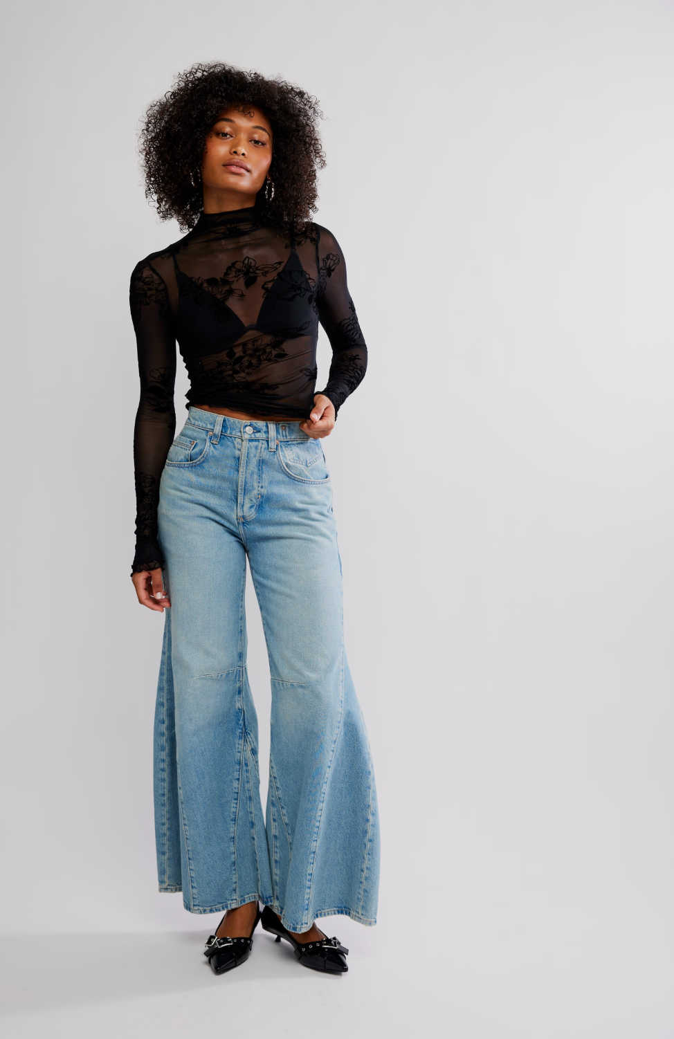 Edgy and perfect for layering, this long sleeve from Intimately features a sheer mesh fabrication, a mock neck design, and a lettuce trim for an added dimension.