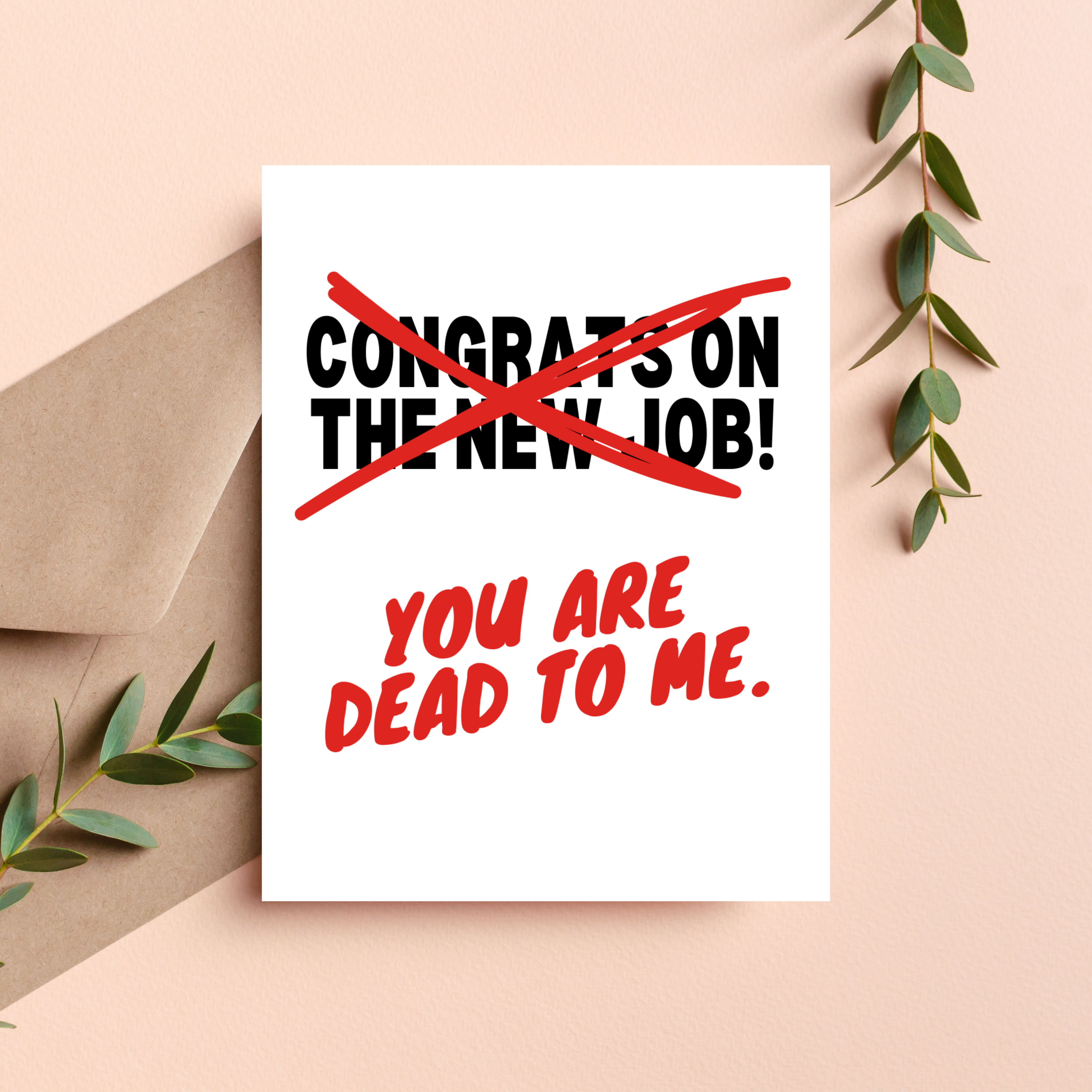 Congrats on the new job! You are dead to me." Perfect for sending off a colleague with humor and sass. Each A2-sized card (4.25in x 5.5in) comes with a kraft envelope.