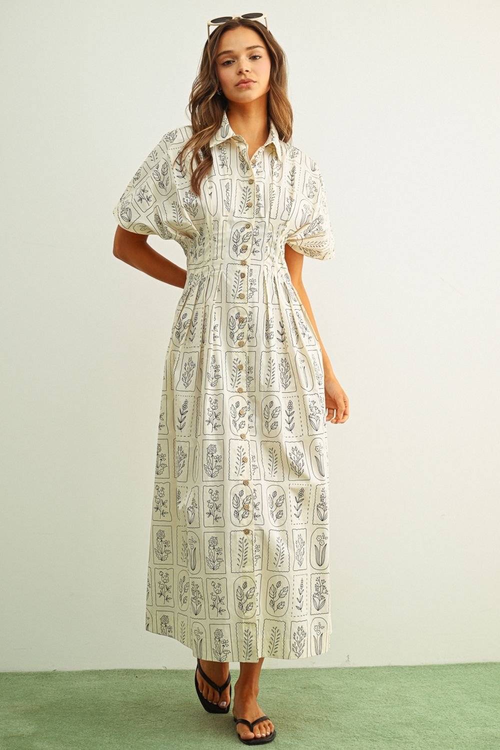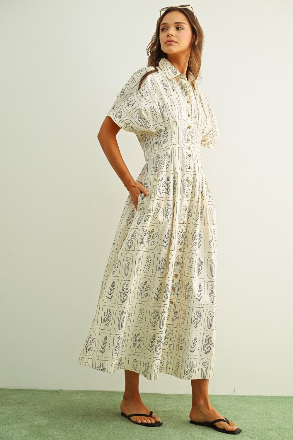 Sweet and timeless shirt dress with garden plant design. Featuring an easy fit, button front, cinched waist, and pockets!