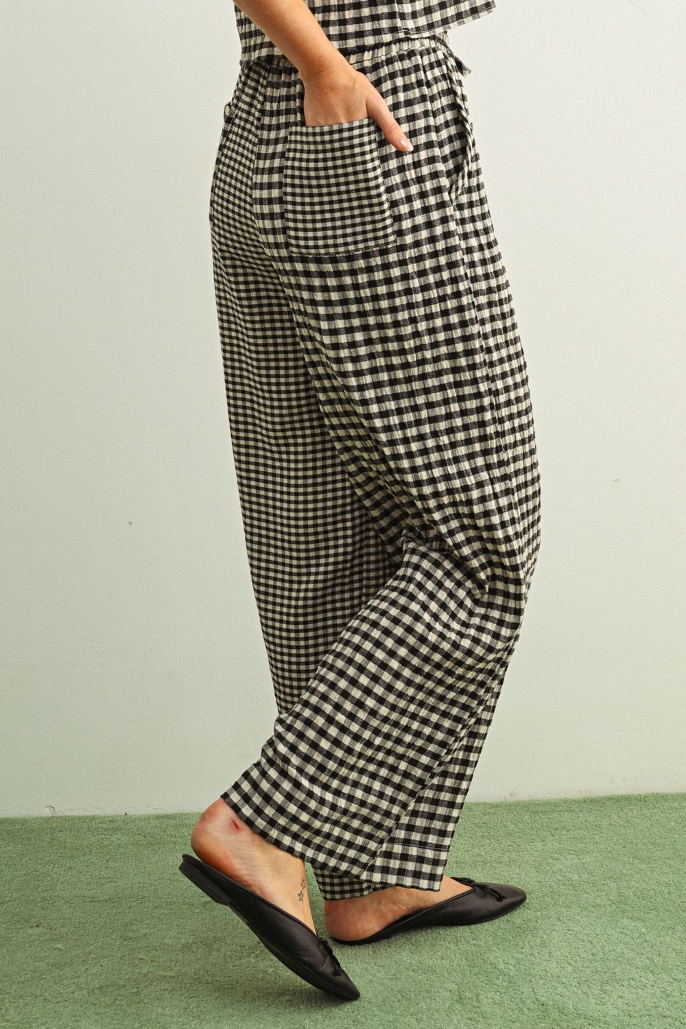 Straight fit gingham mixed pattern pants with an easy fit, elastic waistband, and pockets. Pair with the matching Gingham Tank for the cutest set!
