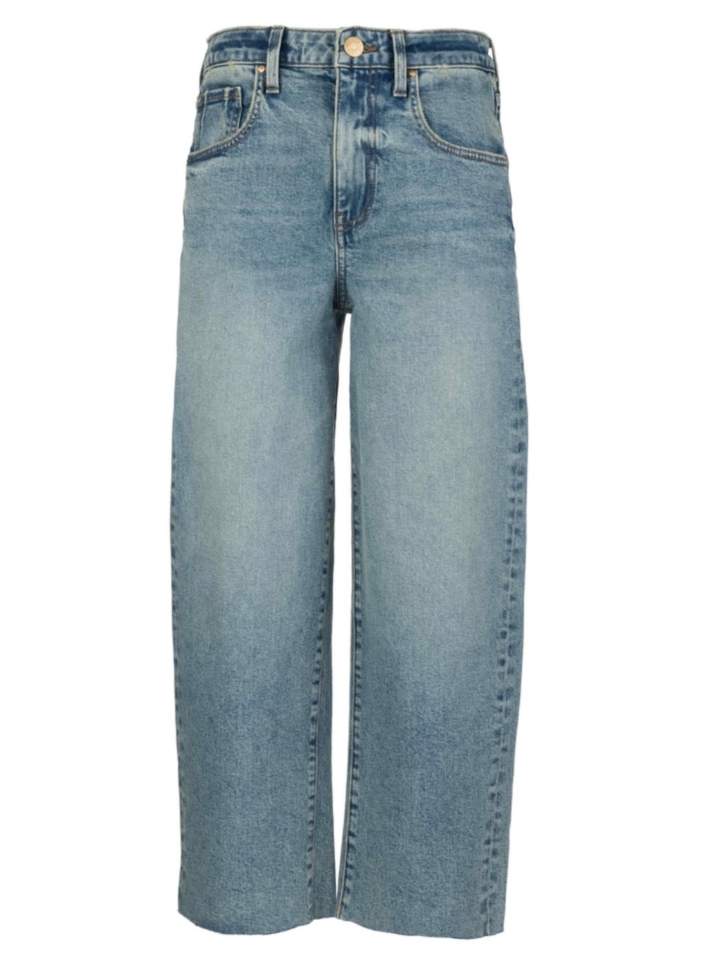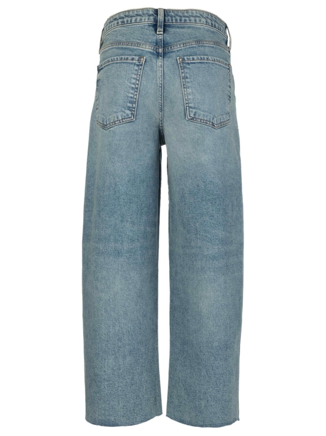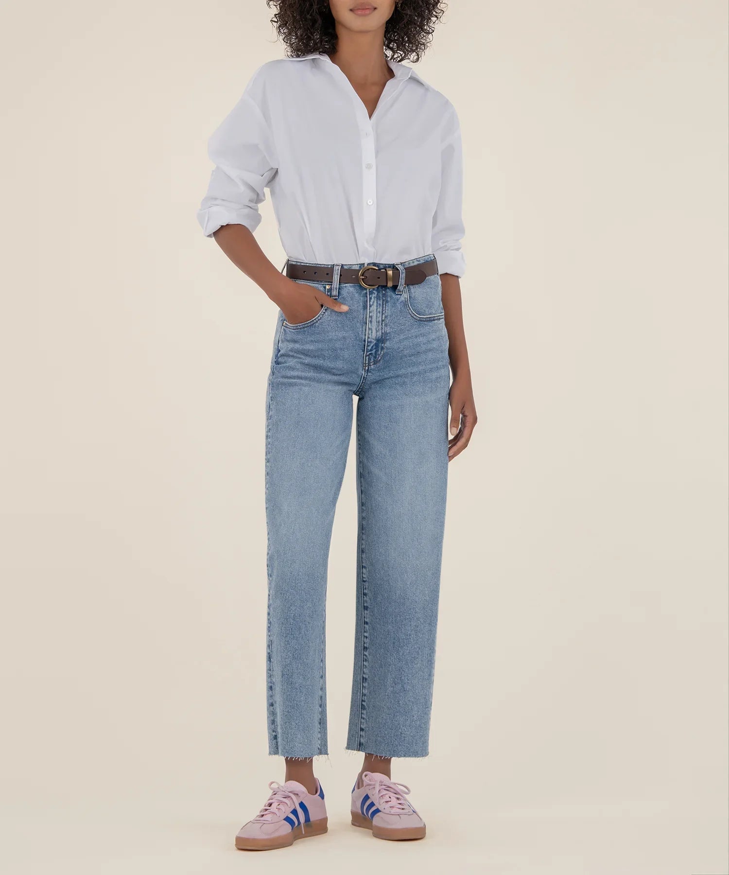 These high rise jeans feature a slouchy wide leg, raw hem, and classic five-pocket design. The medium wash gives them a vintage vibe, perfect for laid-back, everyday style.