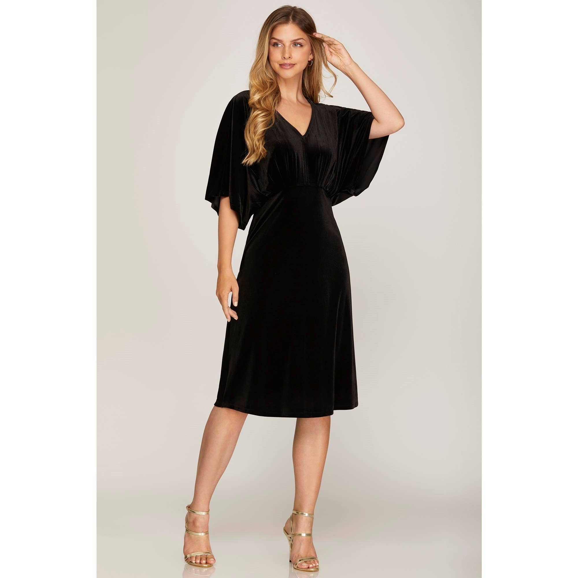 Gorgeous kimono sleeve style velvet dress perfect for holiday parties or work! Featuring a v-neck front and midi length.