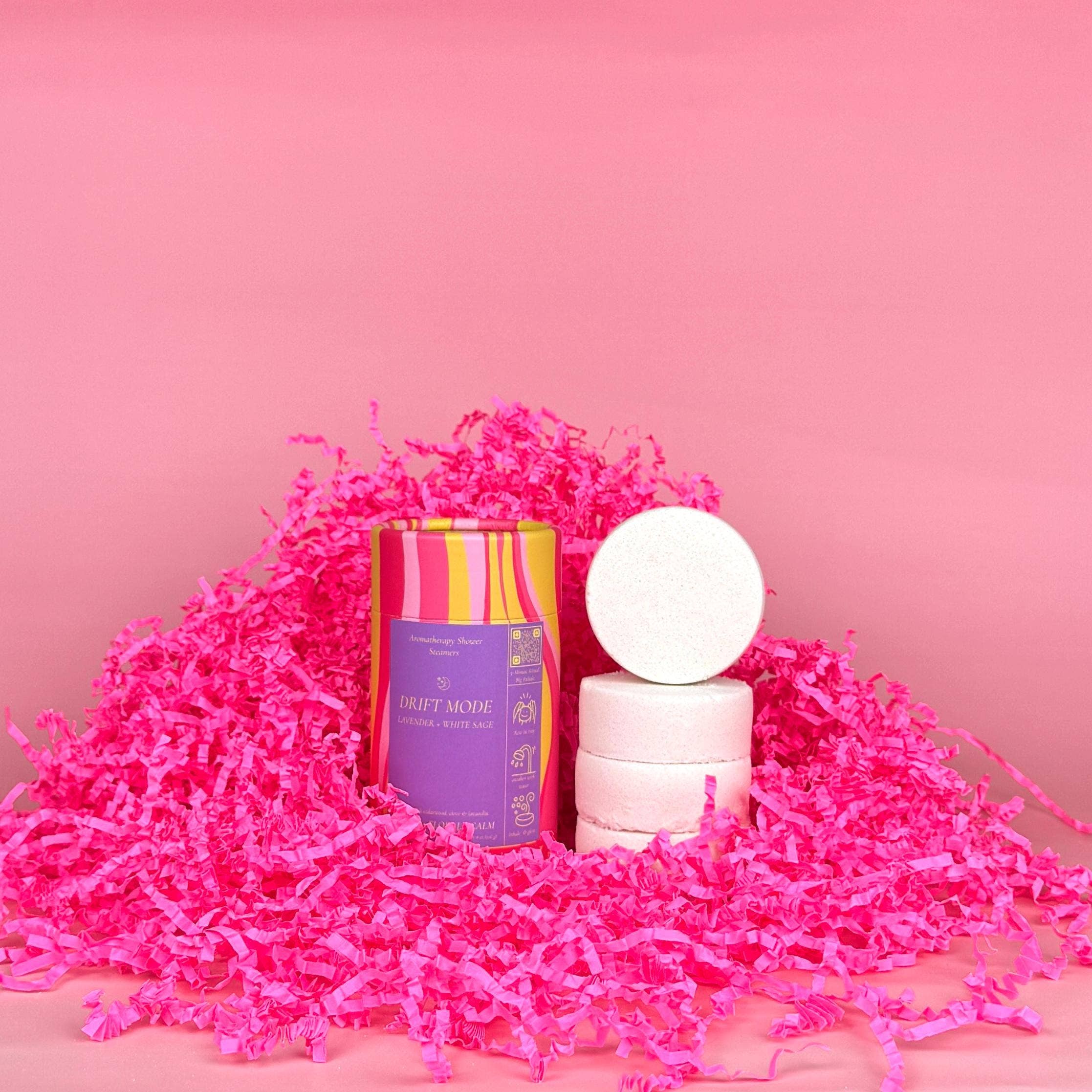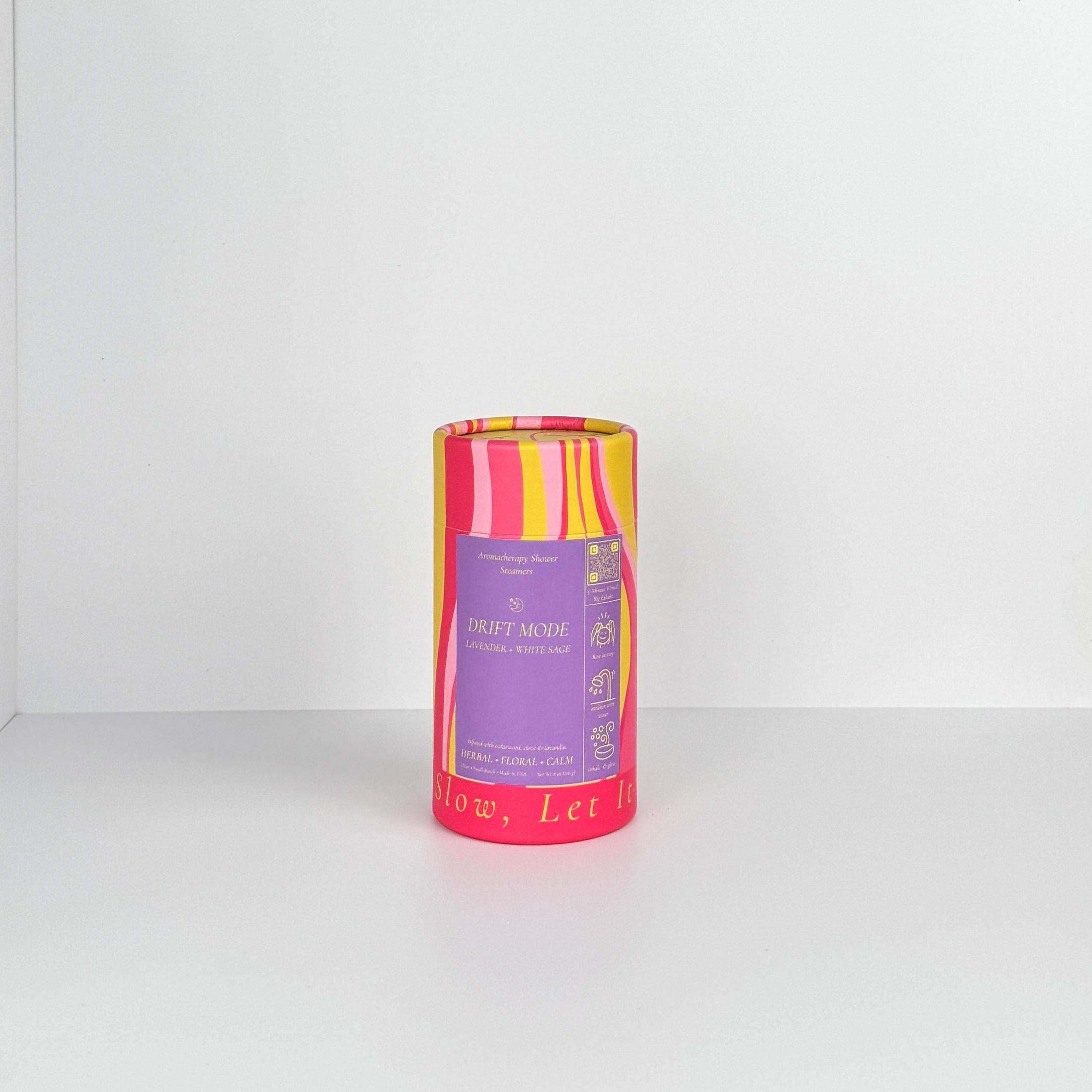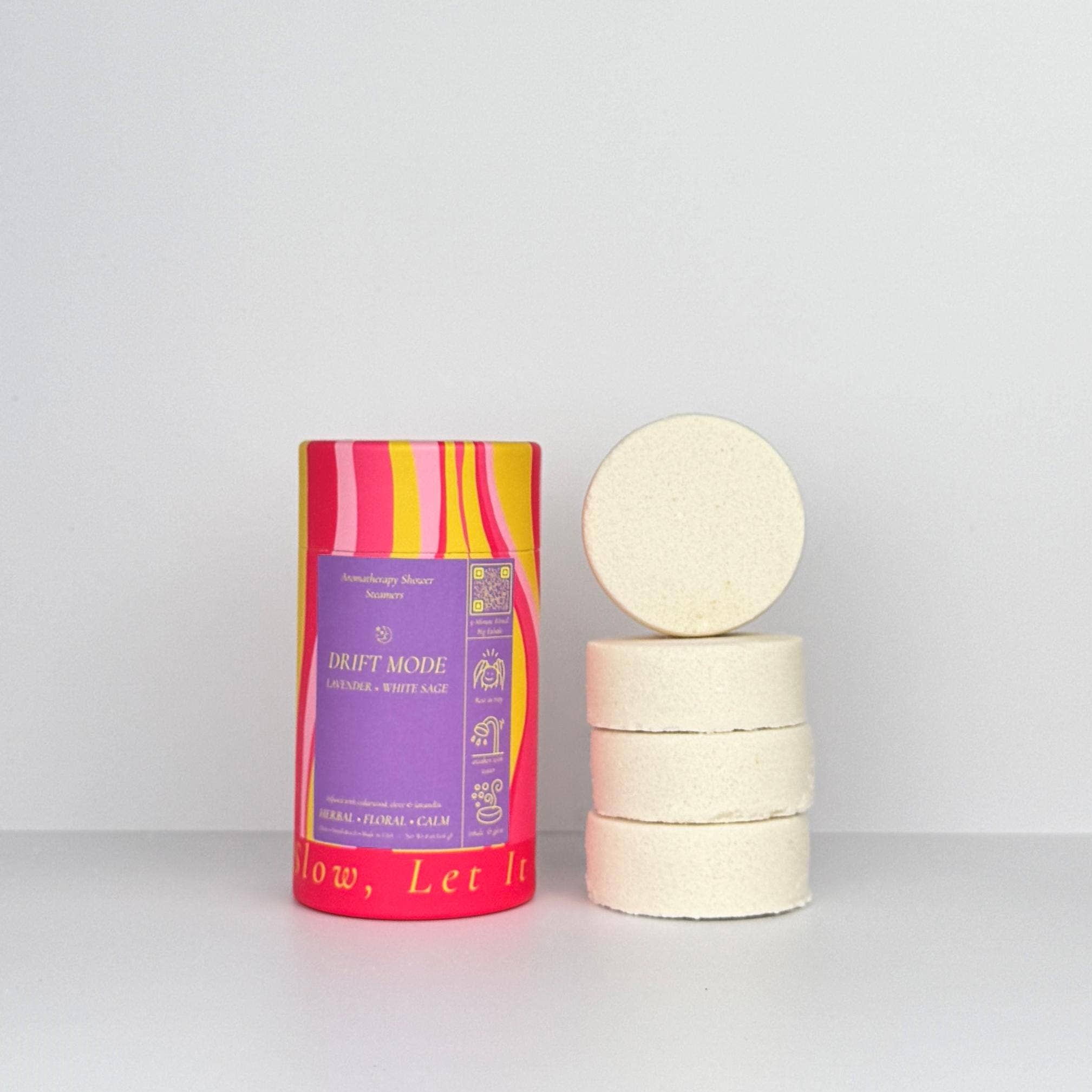 Lavender + White sage shower steamer — a calming aromatherapy shower bomb for wind-down and stress relief. Herbal steam, soft woods, cozy nights, gift-ready. Settle into evening with a clean, herbal blend that feels like a modern apothecary in steam. As Drift Mode fizzes, lavender, sage, and rosemary unwind the day while soft cedar and sandalwood ground your mood.