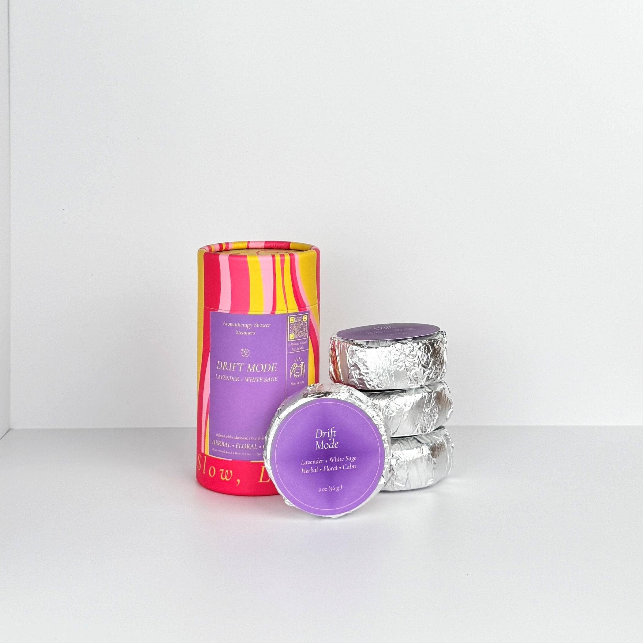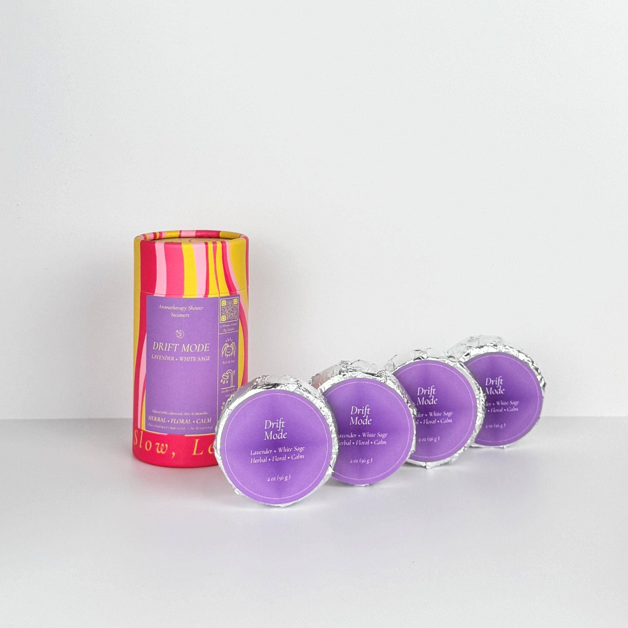 🌙 DRIFT MODE — Lavender + White Sage shower steamers • Scent & Mood: Herbal • Calm • Restful • What you get: luxury paper tube with 4 XL shower steamers · Net wt 4x2 oz (226 g).