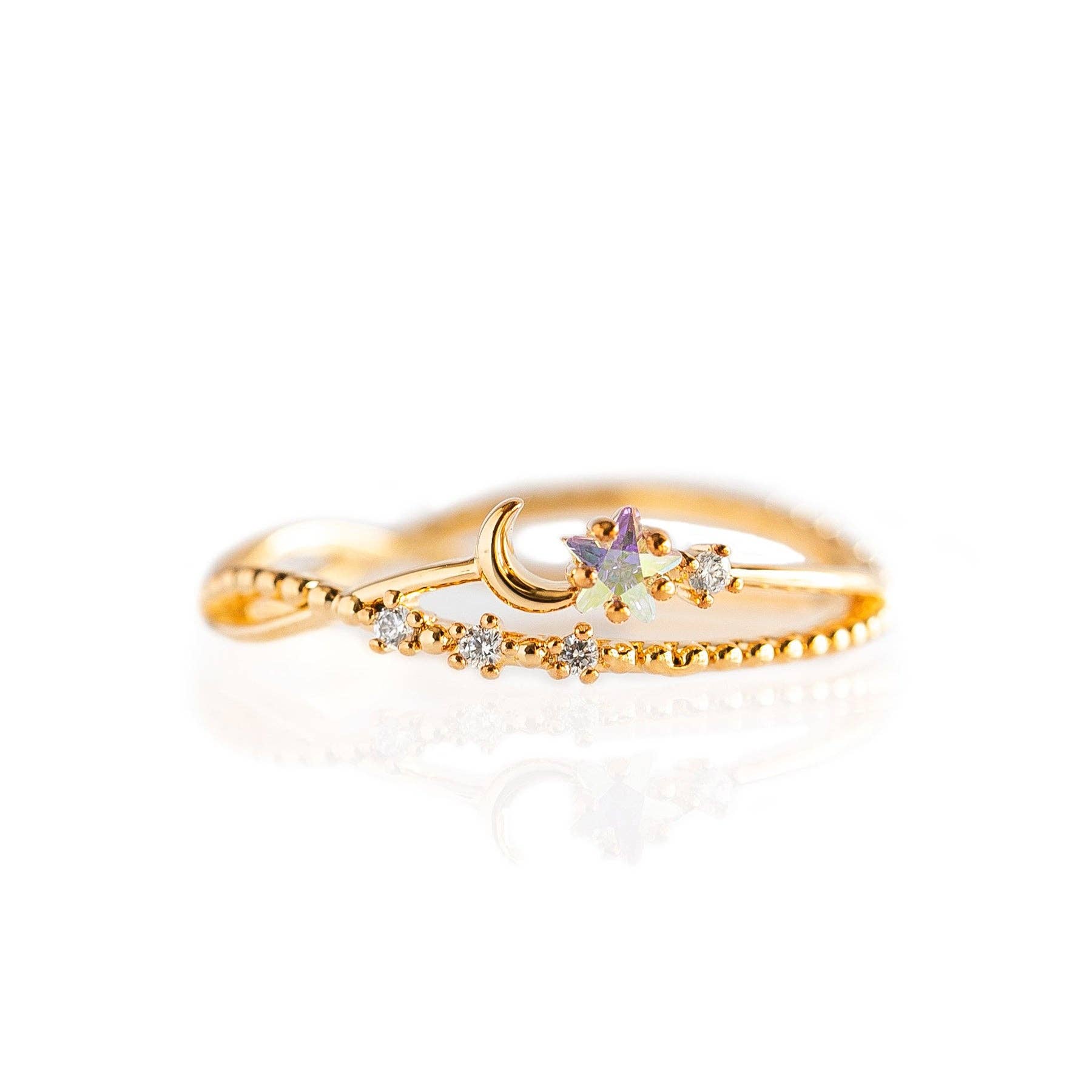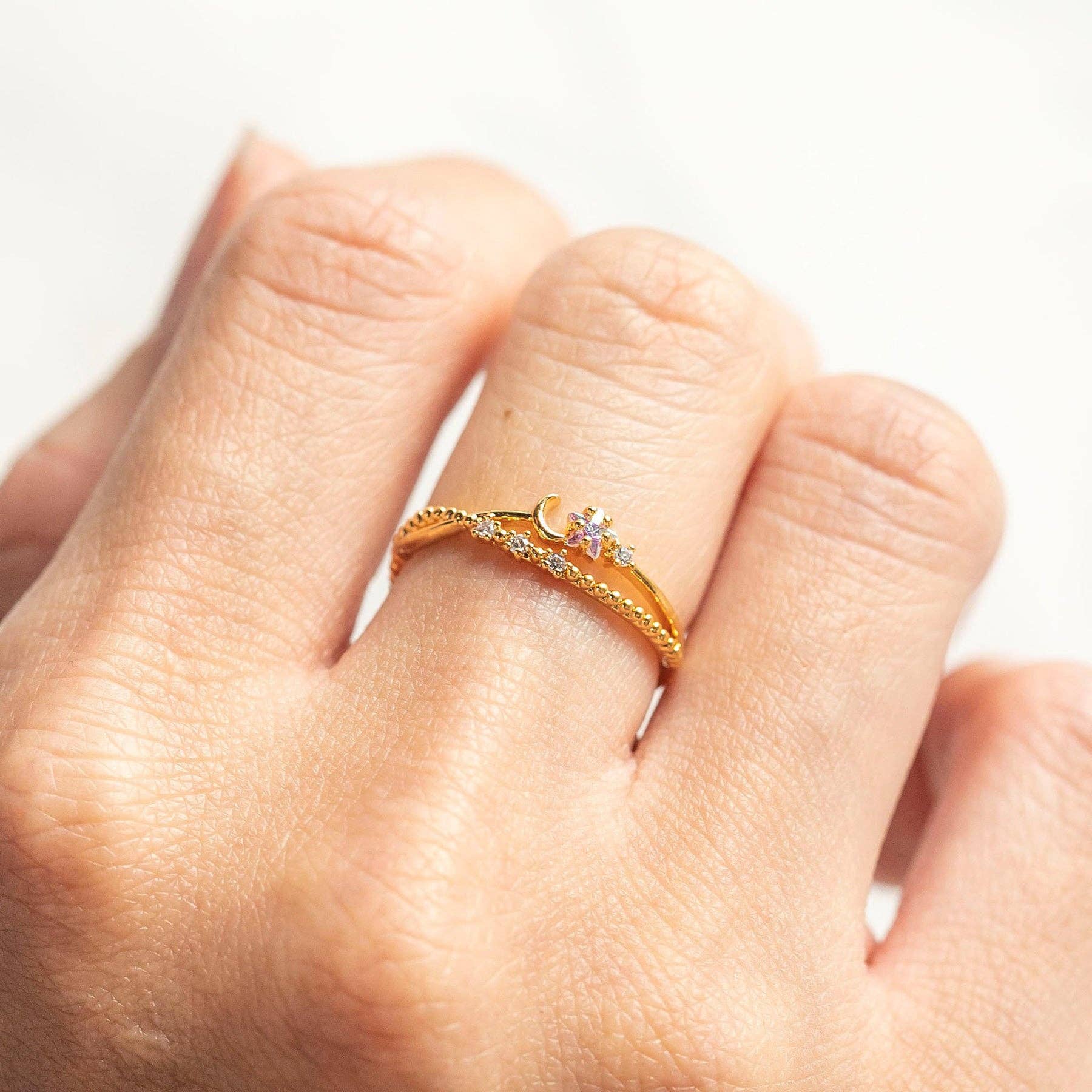 The moon will always shine bright for you! This double-banded ring is so beautiful and unique with its curved design. * 18k gold plated, 18k rose gold plated, or rhodium plated over brass with a protective coating * Cubic zirconia stones *Approx 4mm width