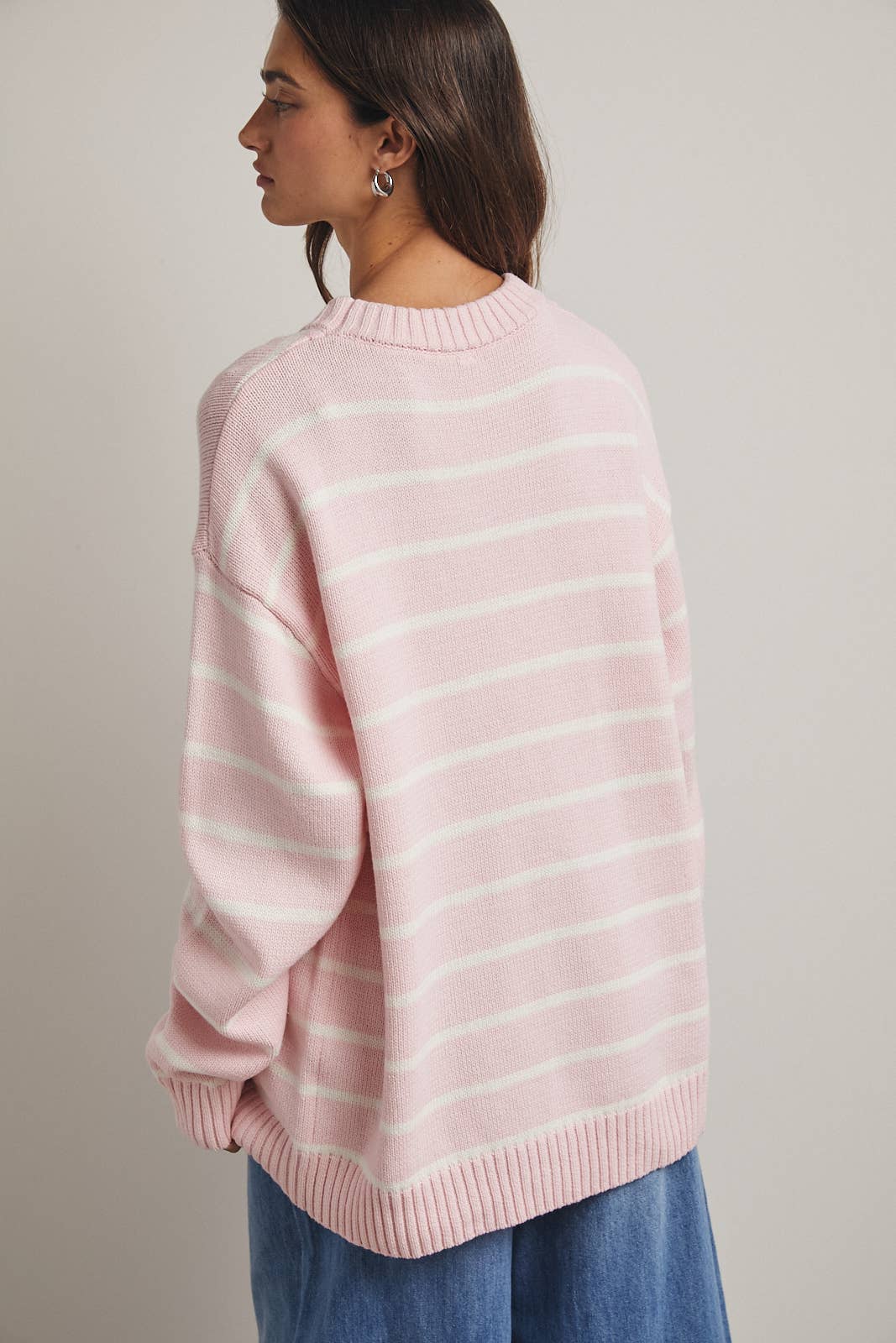 Oversized stripe knit sweater with drop shoulders and cozy fit.