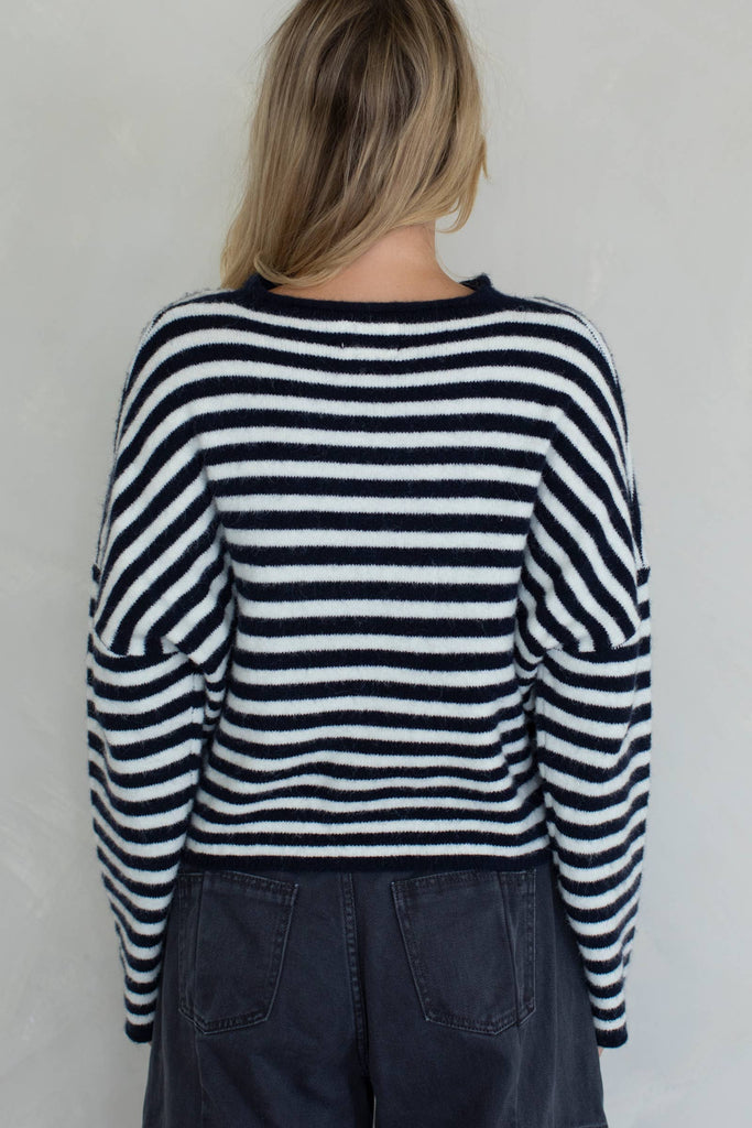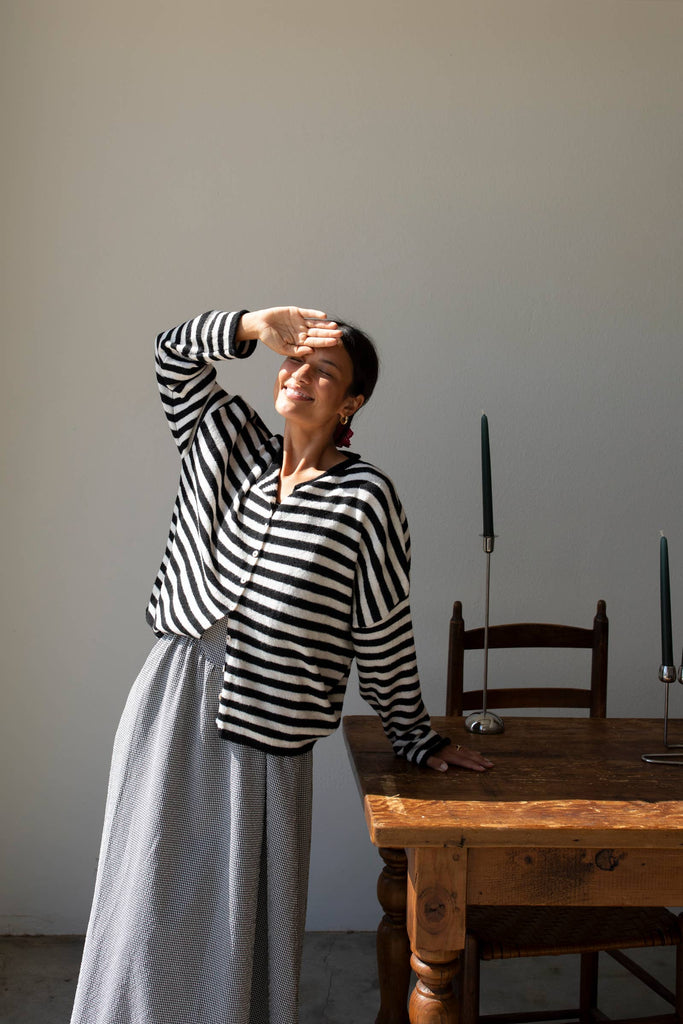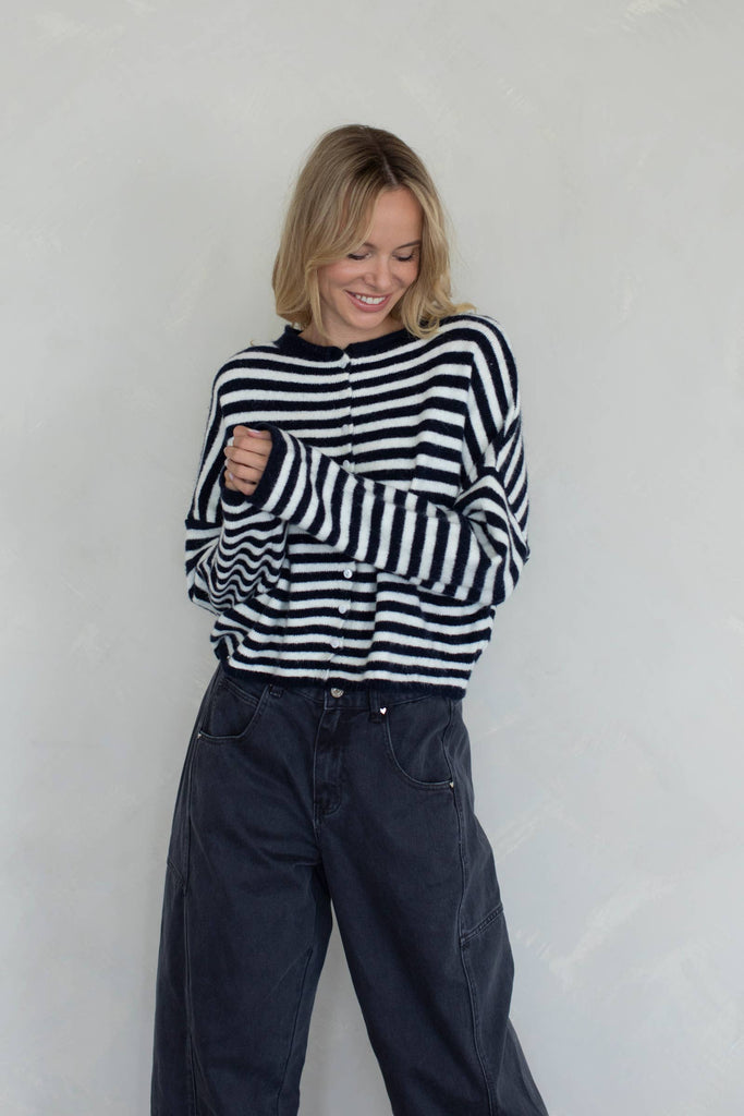 Bestselling soft and cozy relaxed fit cardigan in mini stripes - lightweight and featuring a rolled edge finish on the sleeves and collar.