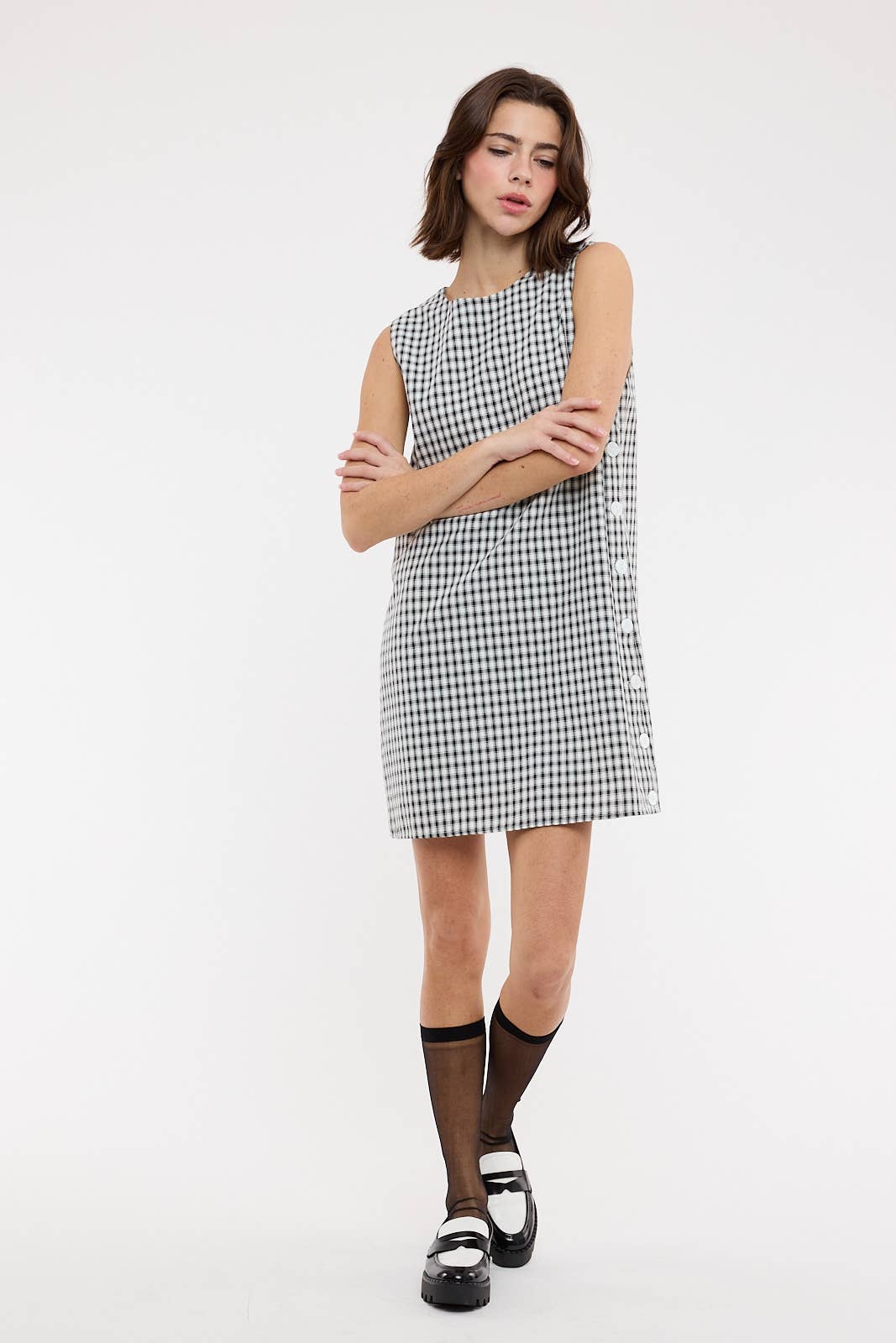 Side button plaid mini dress with functional buttons. Sleeveless, easy fit. and SO CUTE!