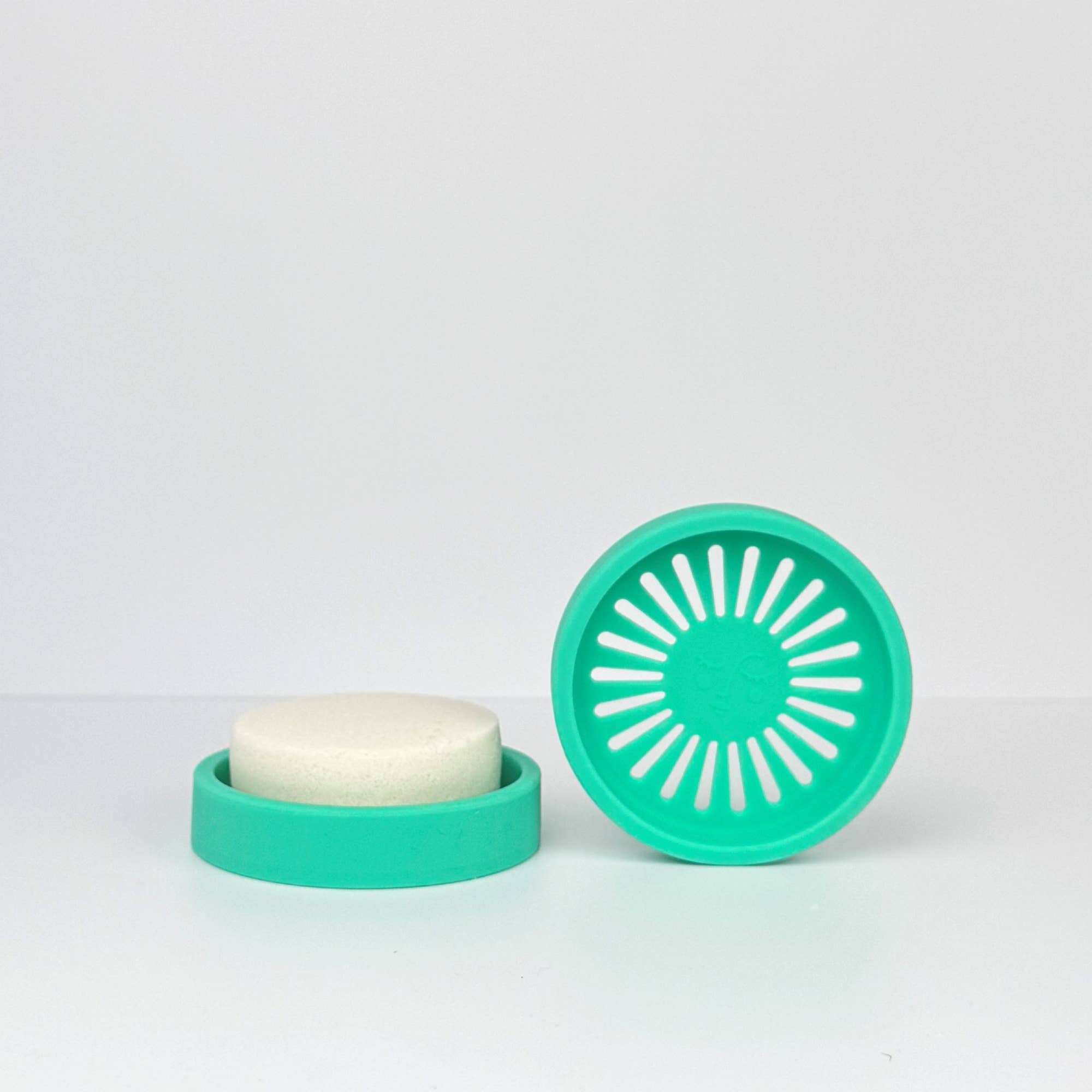 Shower steamers tray / shower steamer holder in food-grade silicone. Exclusive SloGlo design, fits most steamers; self-draining; dishwasher-safe. Meet your steamer’s happy place! This compact shower steamers tray was engineered just for steamers. Sunburst drainage channels lift the tablet so water flows around it (not over it) for a slower, steadier scent. Minimal look, bright mood, tidy shower.