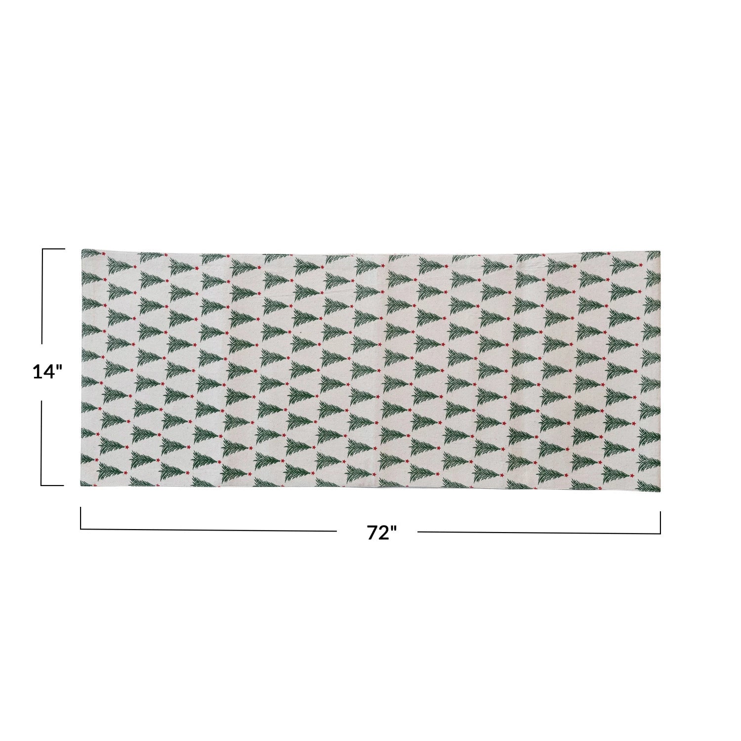 Add some warmth and charm to the dining table with this stonewashed cotton-printed table runner with a Christmas tree pattern in natural, green, and red.