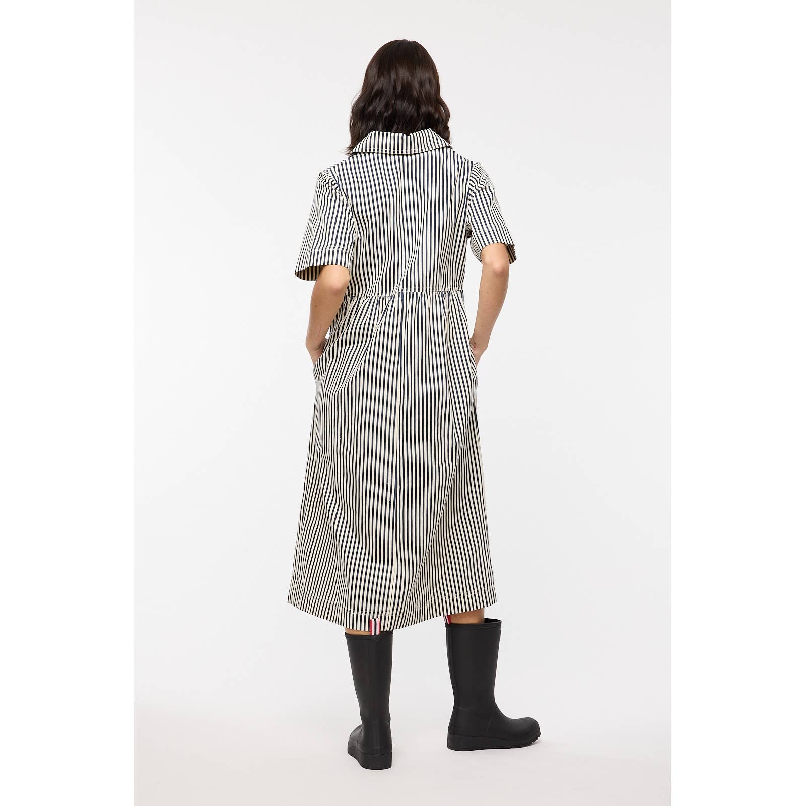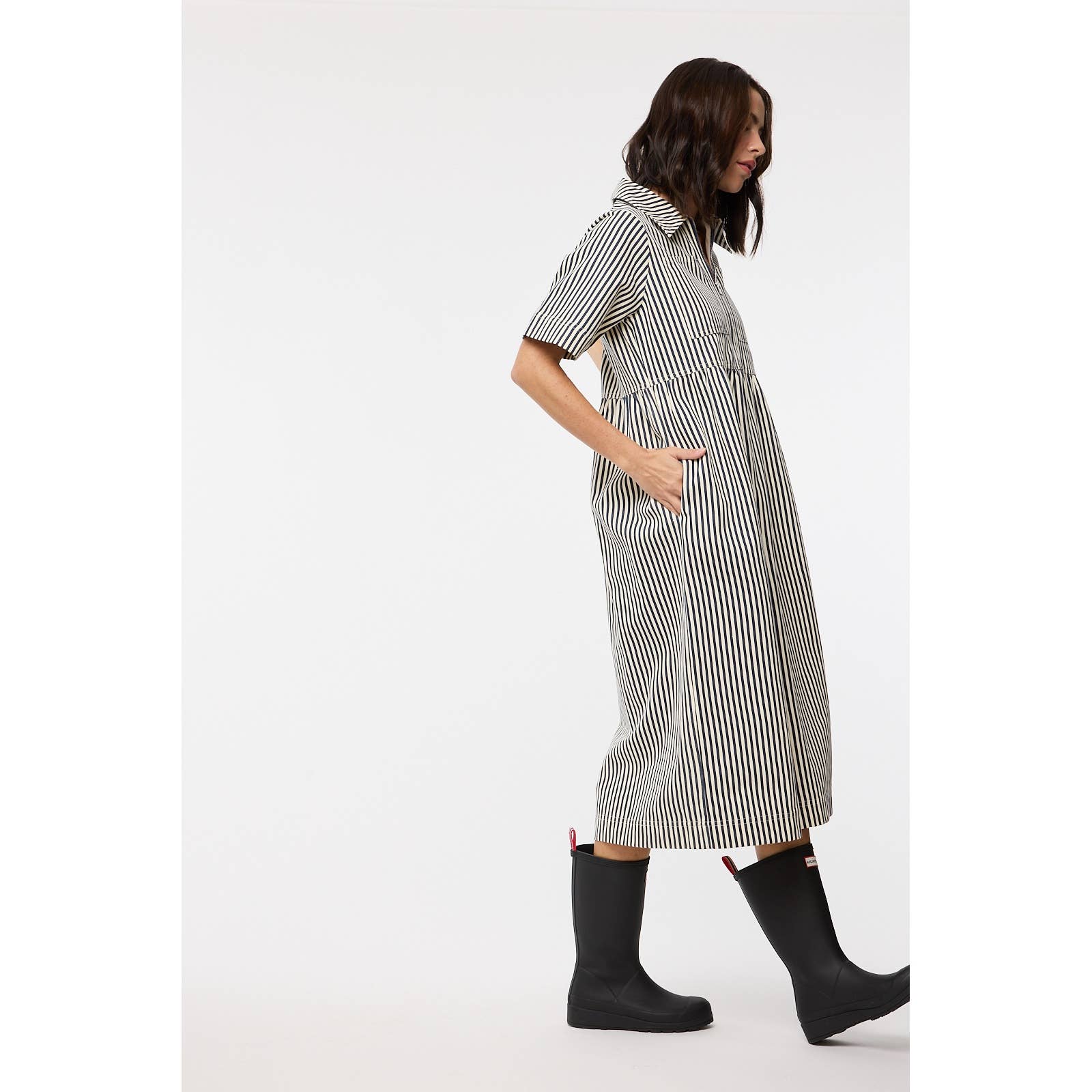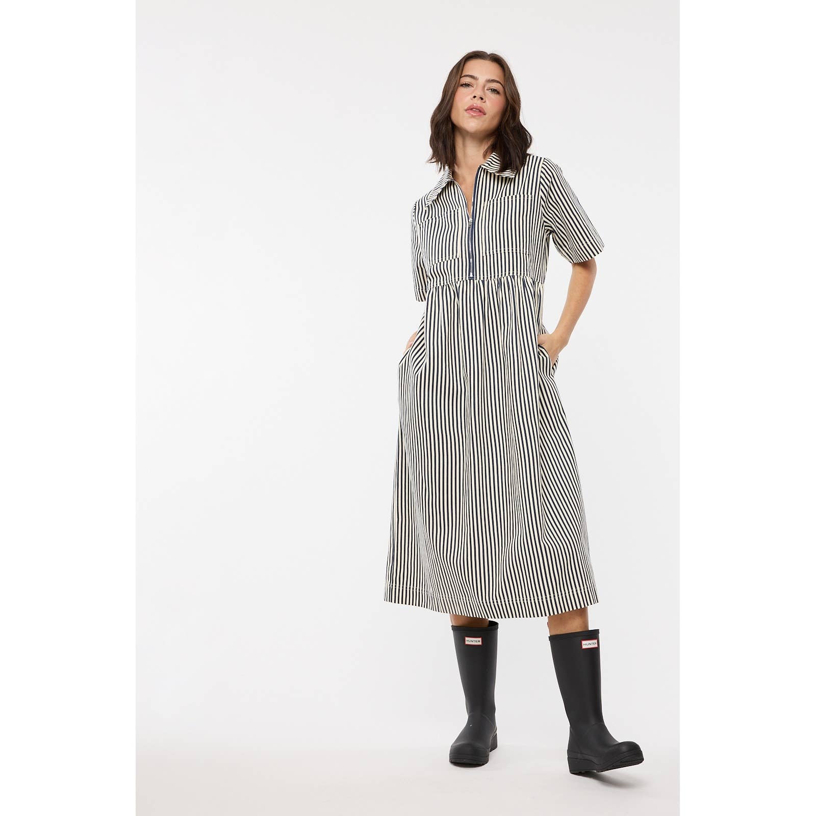 Striped half-zip midi dress with front and side pockets. Perfect for the office, everyday. or vacation! Easy fit.