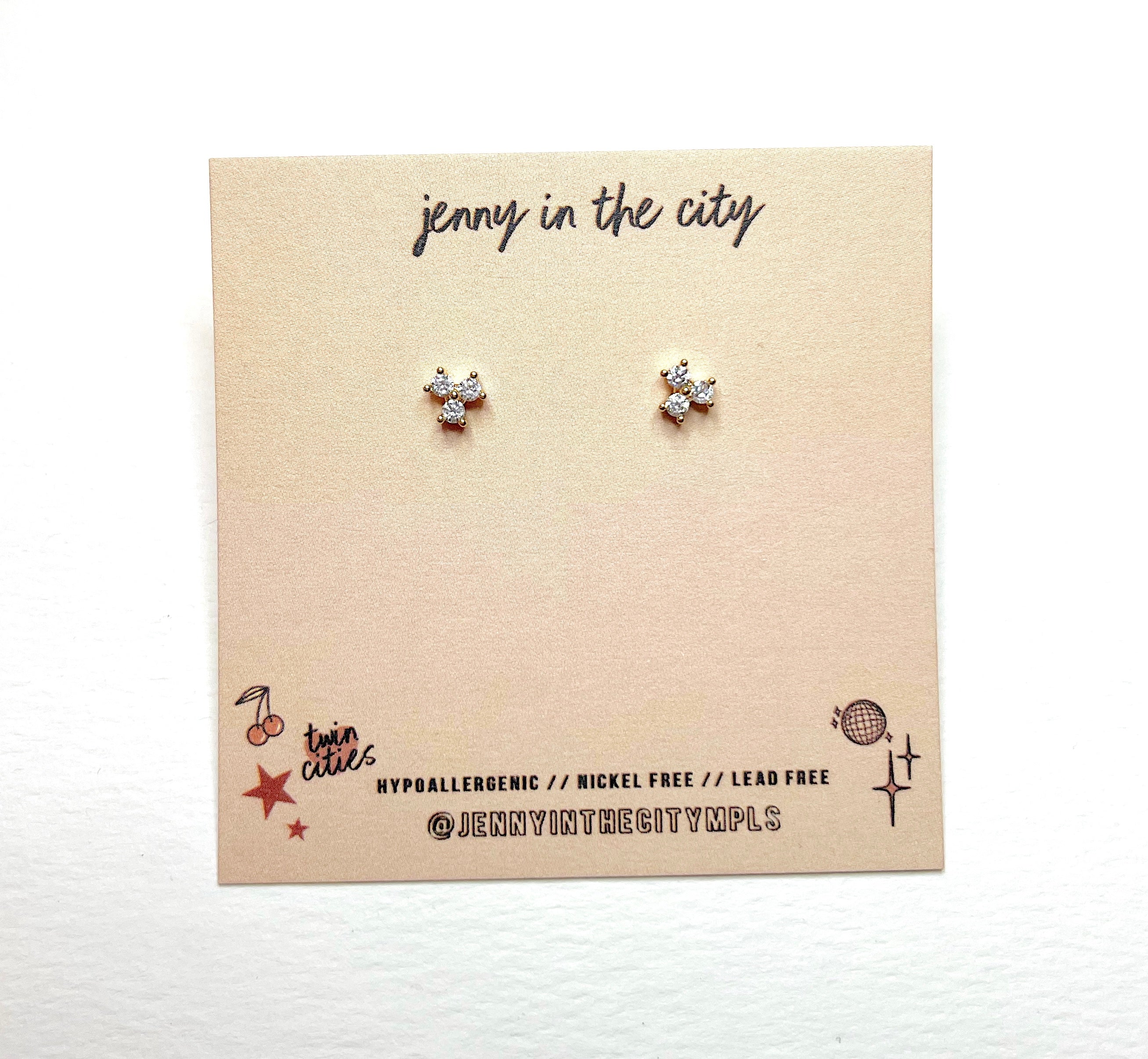 18K Gold plated over brass sparkly stud earrings with paved cubic zirconia gems.