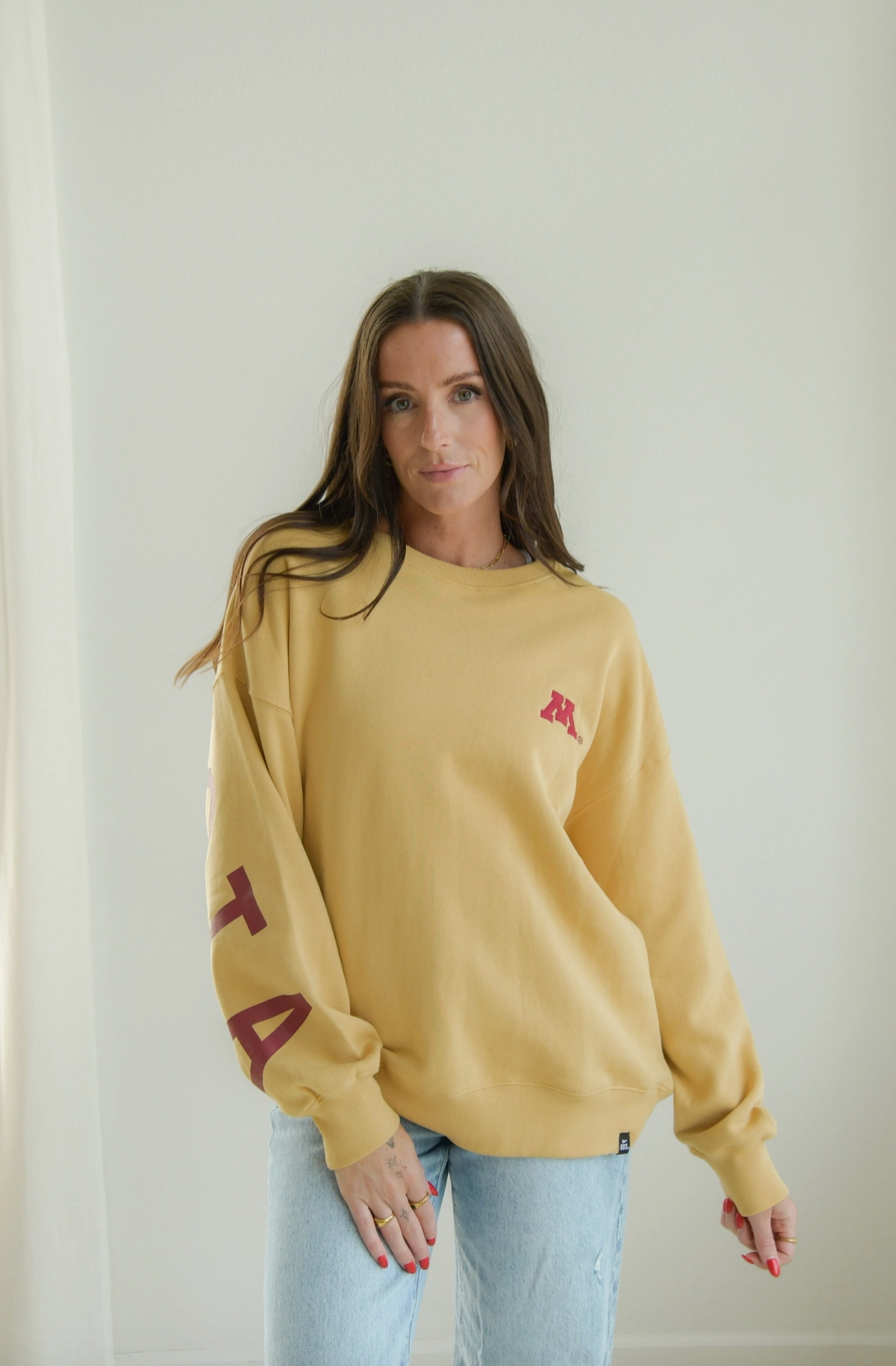 Cozy crew sweatshirt with varsity style letters across the back/arms! The cutest way to show some Minnesota love!