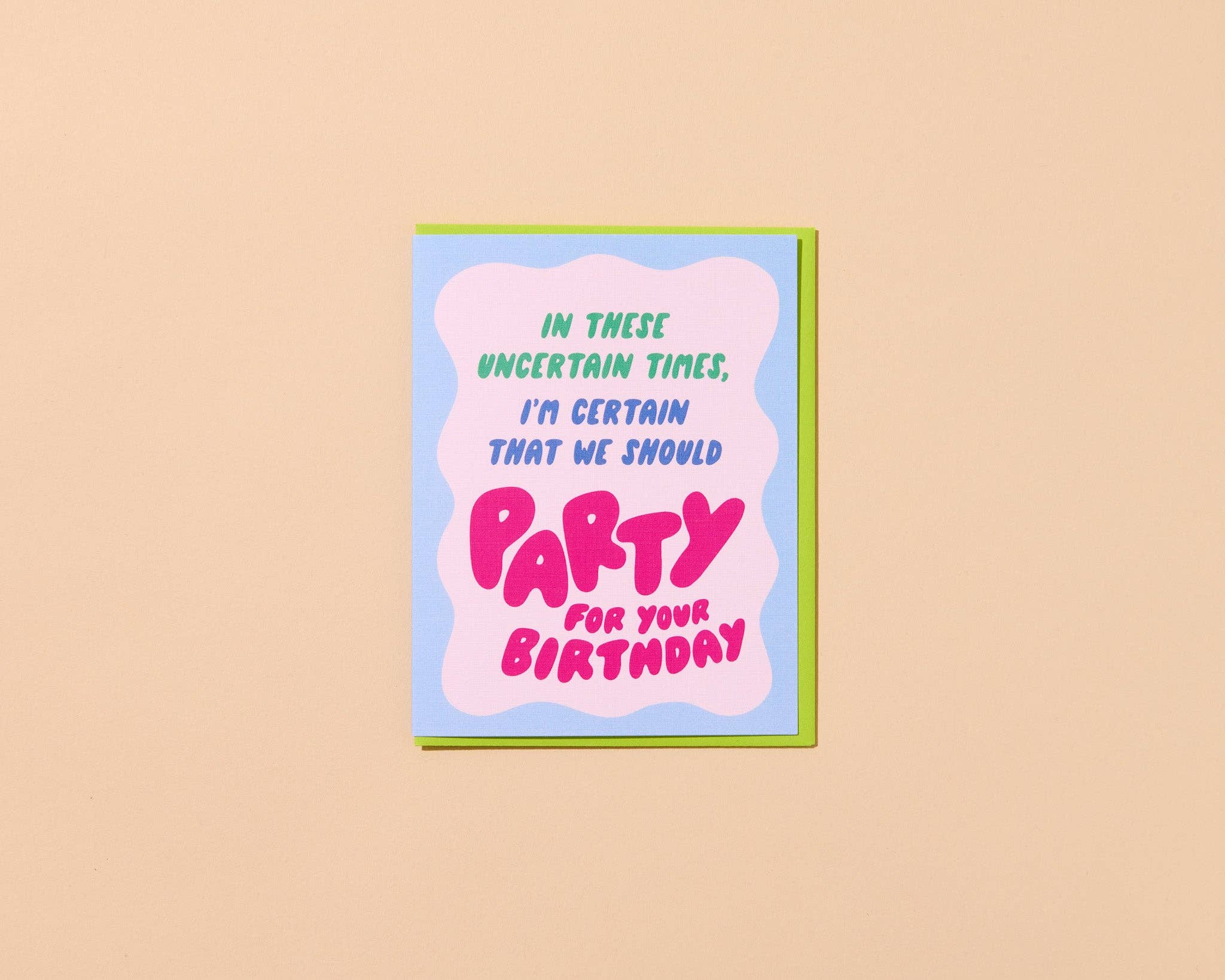 • Card reads, “In these uncertain times, I'm certain that we should PARTY for your birthday”