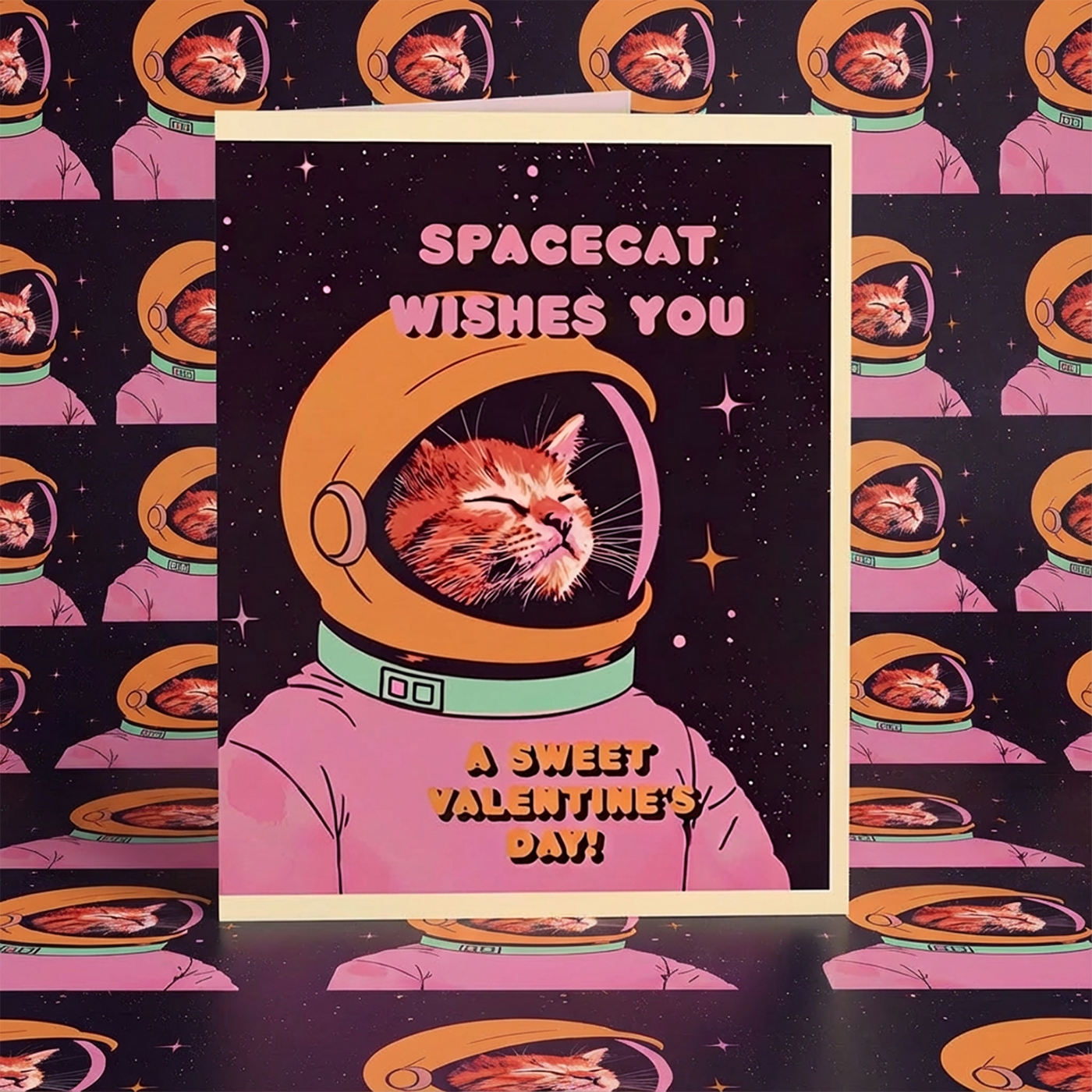 "Space Cat wishes you a sweet Valentine's Day" A2 style card w/envelope.
