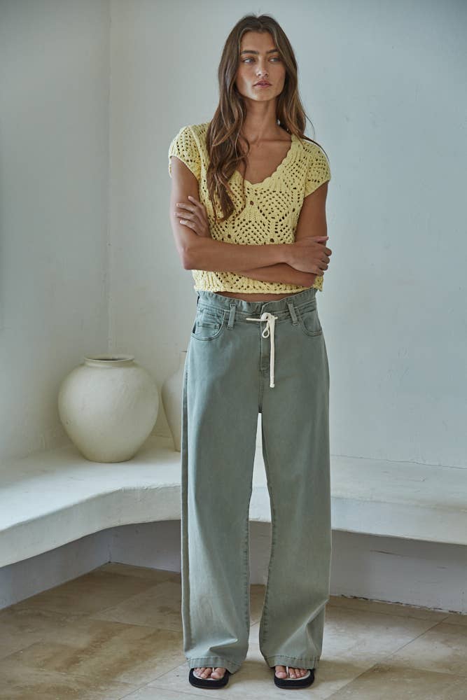 Short sleeve knit crochet sweater top featuring a v-neck. Wear on it's own, or layer a long sleeve or button up underneath.